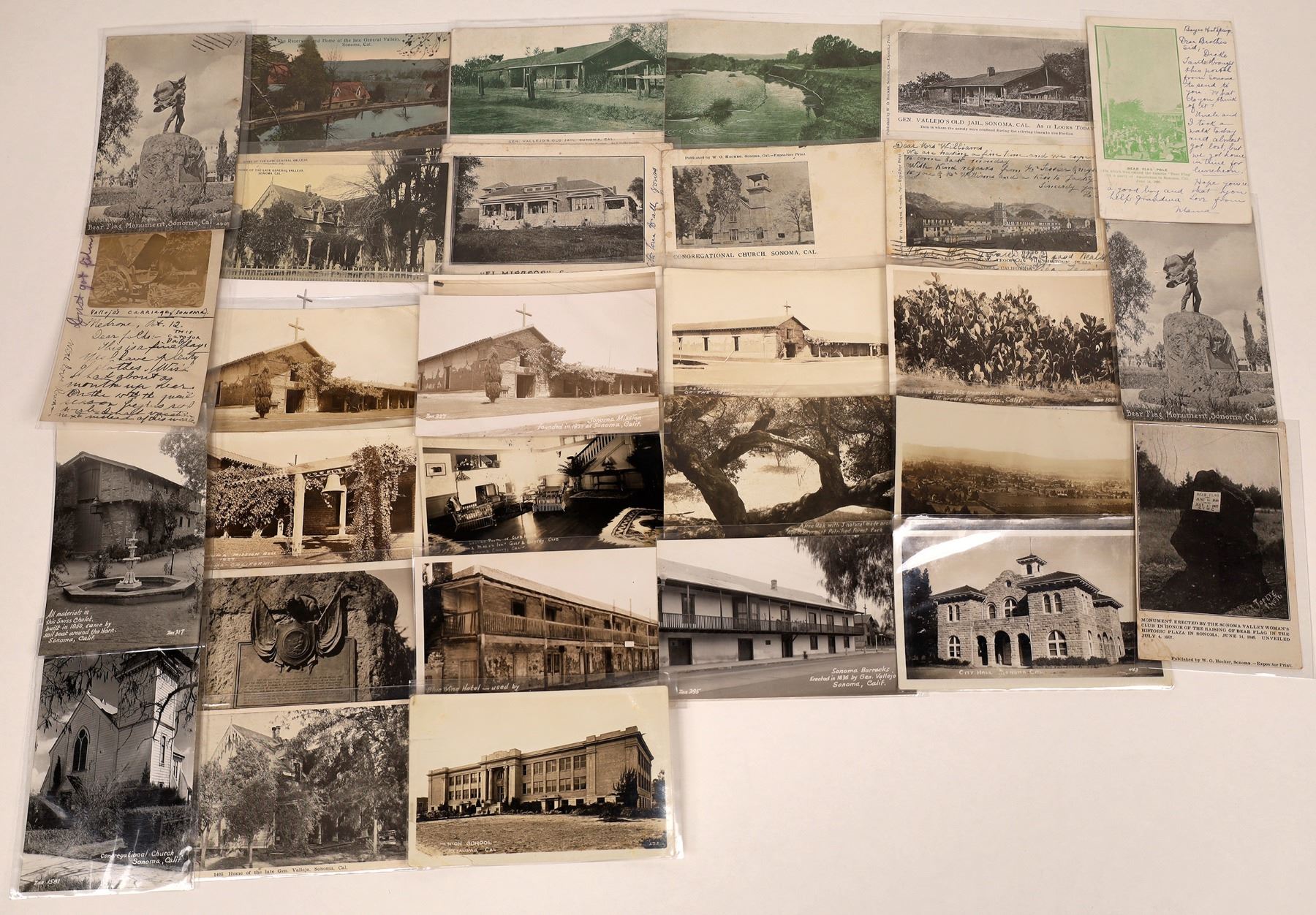 About 32 postcards from the Sonoma, California, area. Four color, nine B&W, and 19 RPCs. Places include the Home of General Vallejo; Vallejo's Old Jail; Congregational Church; Bear Flag Monument; Sonoma Mission; Sonoma Barracks; Blue Wing Hotel; City Hall; and the High School.