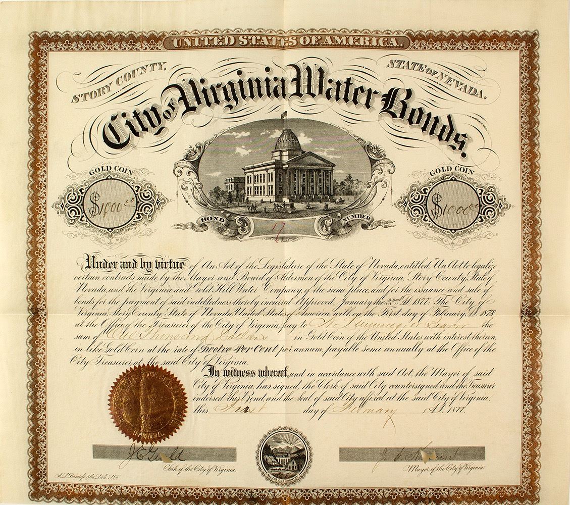 Early number 17. To N. Bunning. Signed by mayor and auditor. Folds, but otherwise in great condition (no rips, tears, etc.). Punched cancel. Great piece. Date: 1877 Location: Virginia City, Nevada HWAC # 46629