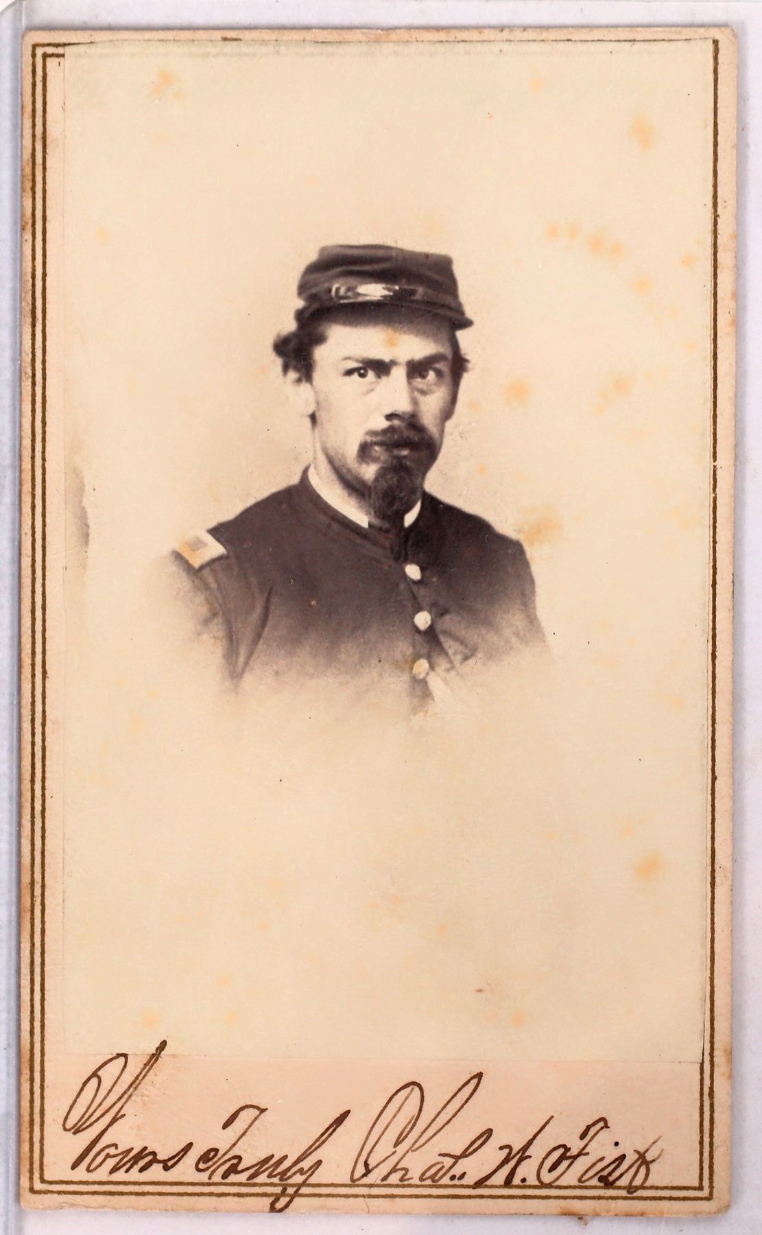 Photo of 1st Lieutenant Chas W Fisk, possibly from Michigan. 4x2.25". Adhesive documentary stamp on verso.