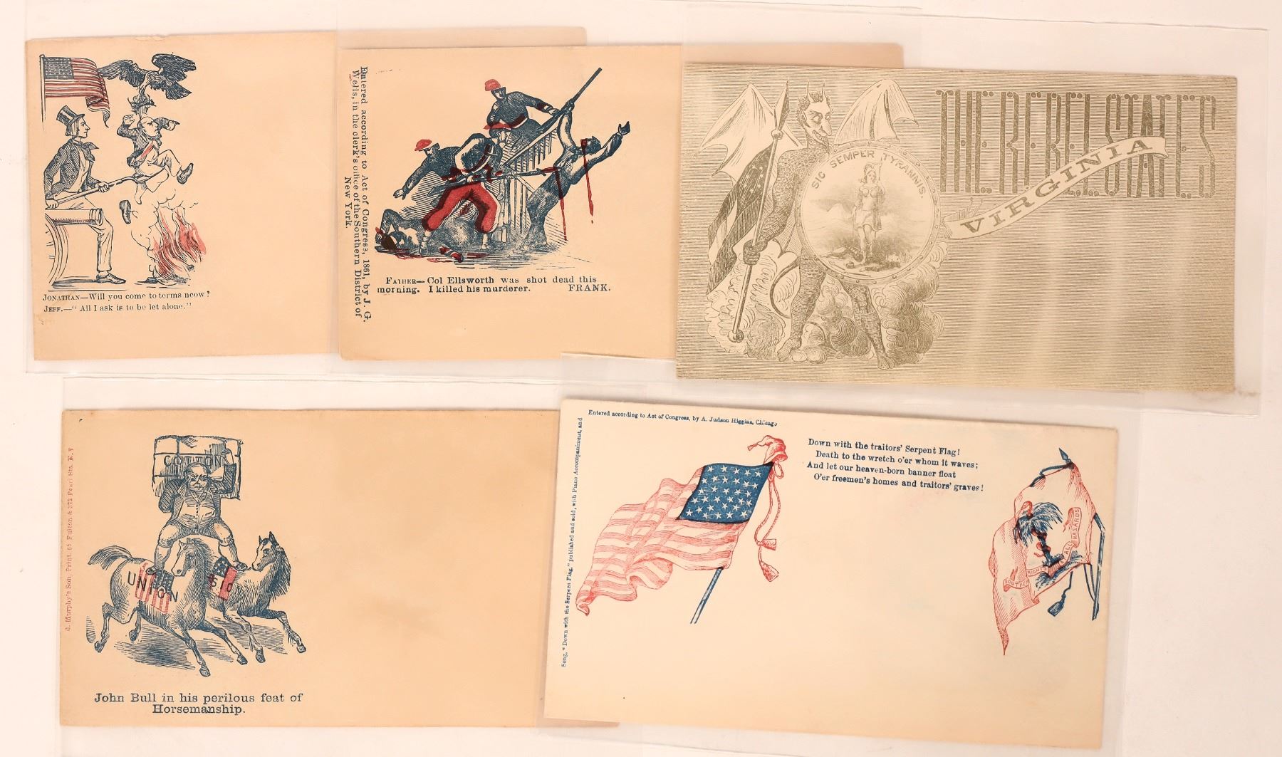 5 different Civil War Anti Rebel patriotic covers. About 3.25x5.5". Devil, John Bull, blood etc.