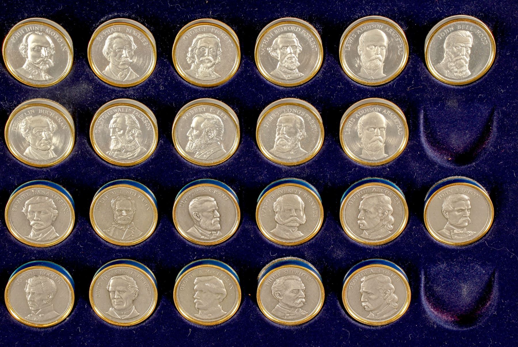 This is an incomplete set of 22 pewter checkers in a decorative wooden box produced by The Franklin Mint. Each piece has the portrait of a notable figure from the Civil War. One piece in each color (the Blue and the Gray) is missing, but we don't know which one. Oddly enough, there are two pieces for Lewis Addison Armistead and two for George Armstrong Custer. Replacement pieces can be found online.