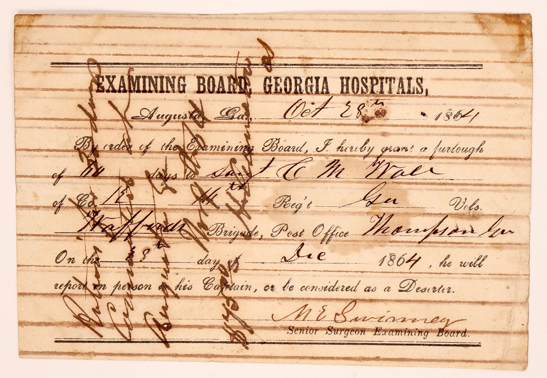 October 28, 1864, Civil War Confederate Document: Furlough granted to Confederate Soldier by "Examining Board Georgia Hospitals,". 4 x 5 3/4 inches, partially printed, additional handwritten information on both sides. Document reads: "Examining Board Georgia Hospitals, Augusta, Ga. Oct. 28th 1864. By order of the Examining Board, I hereby grant a furlough of 60 days to Sargt. C. M. Wall of Co. H 14th Regt. Ga. Vols. Waffard's brigade, Post Office Thompson, Ga. On the 28 day of Dec. 1864, he will report in person to his Captain, or be considered as a Deserter. M. E. Swinney, Senior Surgeon Examining Board." Sgt. Wall's story continues on the back "Transferred from Augusta to Thompson."