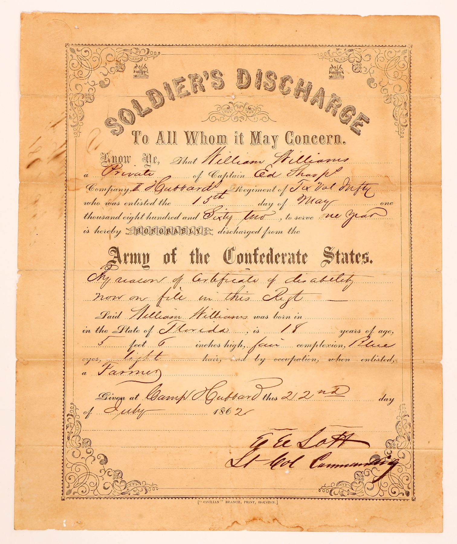William Williams, private of Captain Ed Thorp, is hereby honorably discharge from the Army of the Confederate States. Given at Camp Hubbard 22nd of July 1862. 8 x 10 inches. Camp Hubbard Texas