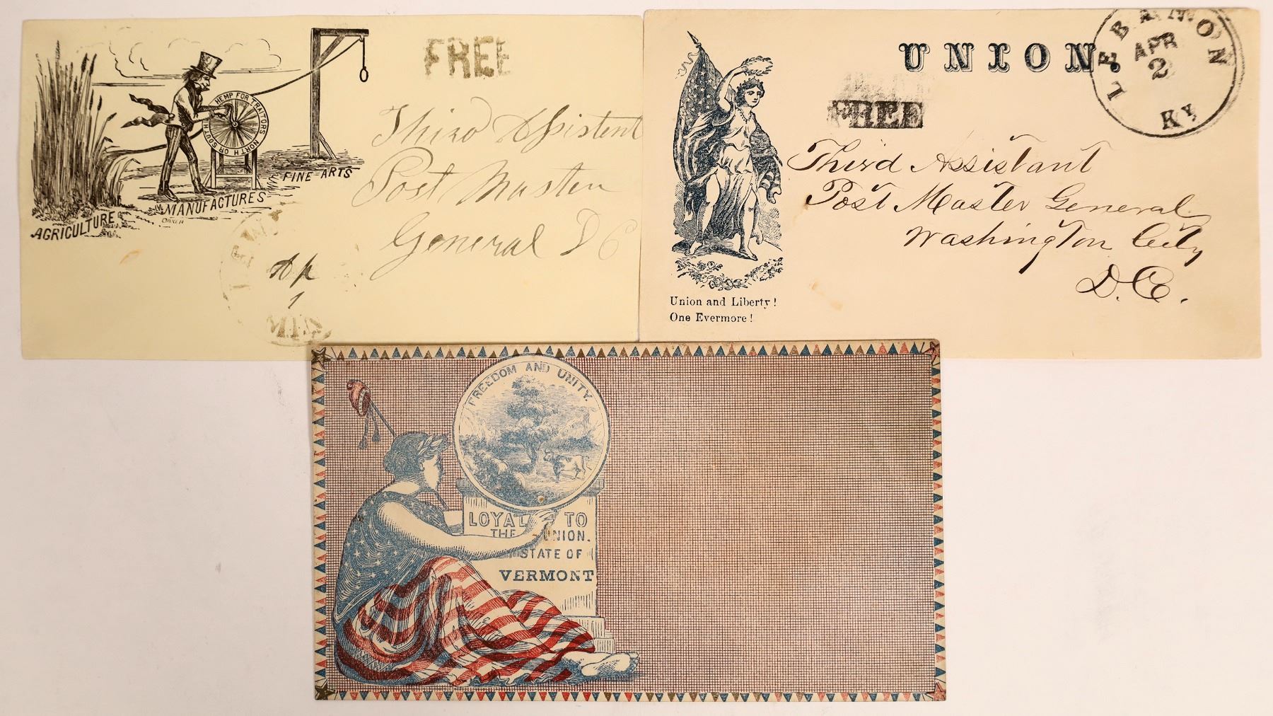 Nice printed material from the Civil War period includes a nice cover, "Loyal to the State of Vermont". Allegorial female with "Freedom and Unity". Also, two postmarked fronts of covers (not the full envelopes) . One is stamped, "Union" and postmarked Lebanon, Ky. The other has a wheel that says, "Hemp for Traitors" with a noose. Postmarked Minn.