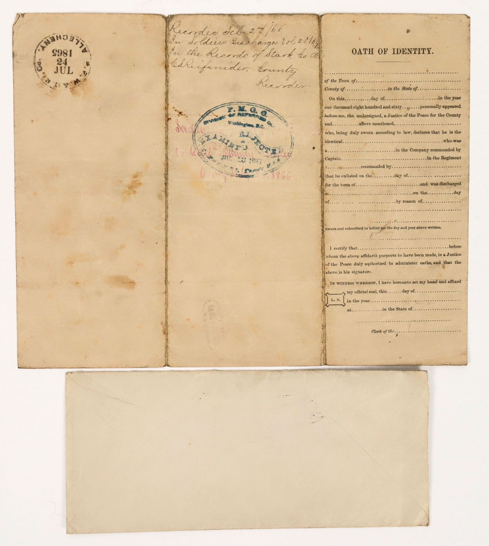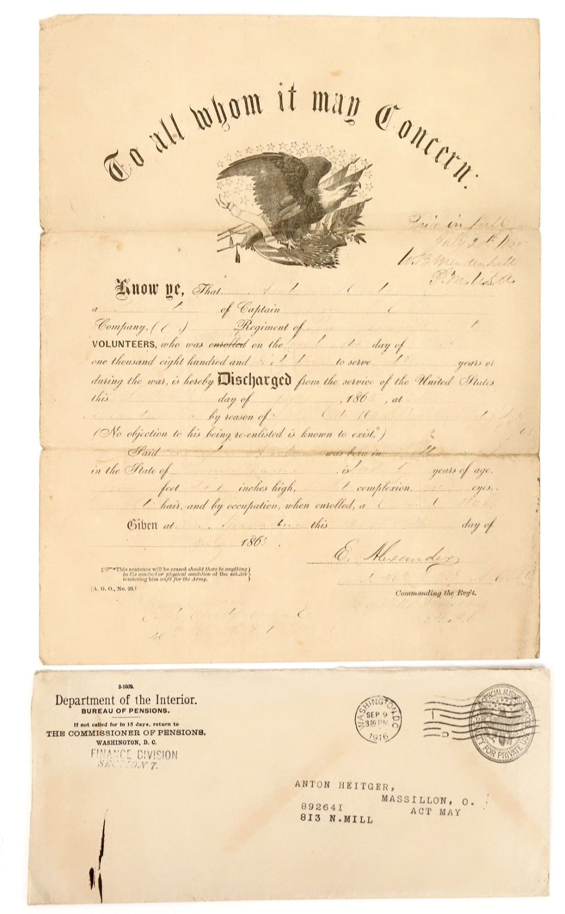 This original document is for the discharge of Anton Heitger of the Pennsylvania Volunteers dated July 16, 1865. He received his discharge in Alexandria, Virginia. Side-notes indicate that he was paid in full on July 20th. The print is bold but the ink fill is very light. A review letter helps identify each word. Very good condition with very light entries. The war would effectively end in April, however, the final surrender would not be until June 2, 1965 in Galveston, Texas. Please see photos for details.