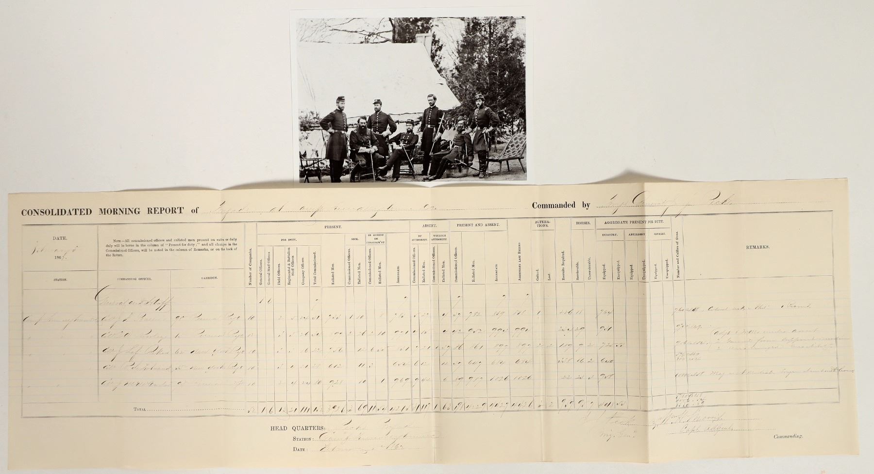 Lot of 2. 1) Feb. 5, 1862 Consolidated Morning Report of Brigade at Tennallytown, DC, Commanded by Brig. General JJ Peck. Includes officers and men of the 15th, 95th, and 98th Pennsylvania Volunteer Infantry and the 55th and 62nd New York Infantry. Signed for Peck by Adjutant Captain William H. Morris. 8.5 x 26" 2) Modern copy of 1862 Tennallytown picture of General JJ Peck and Staff, incl. William Morris (third from right). 5.5 x 7.25" Morris attended West Point and served at Fort Yuma. Along with Charles L. Brown, he invented an improved firearm with a conical cylinder holding 8 cartridges, patented in 1860. He served with Peck's brigade in the Peninsula campaign and the Siege of Yorktown, Battle of Williamsburg, and Battle of Fair Oaks. In 1863, he was promoted to Brigadier General of Volunteers. He was involved at the Battle of Manassas Gap, the Bristoe Campaign, and fought in the Battle of the Wilderness. In 1864, during the Battle of Spotsylvania Court House, he was shot and wounded by a sharpshooter. He saw no further battles.