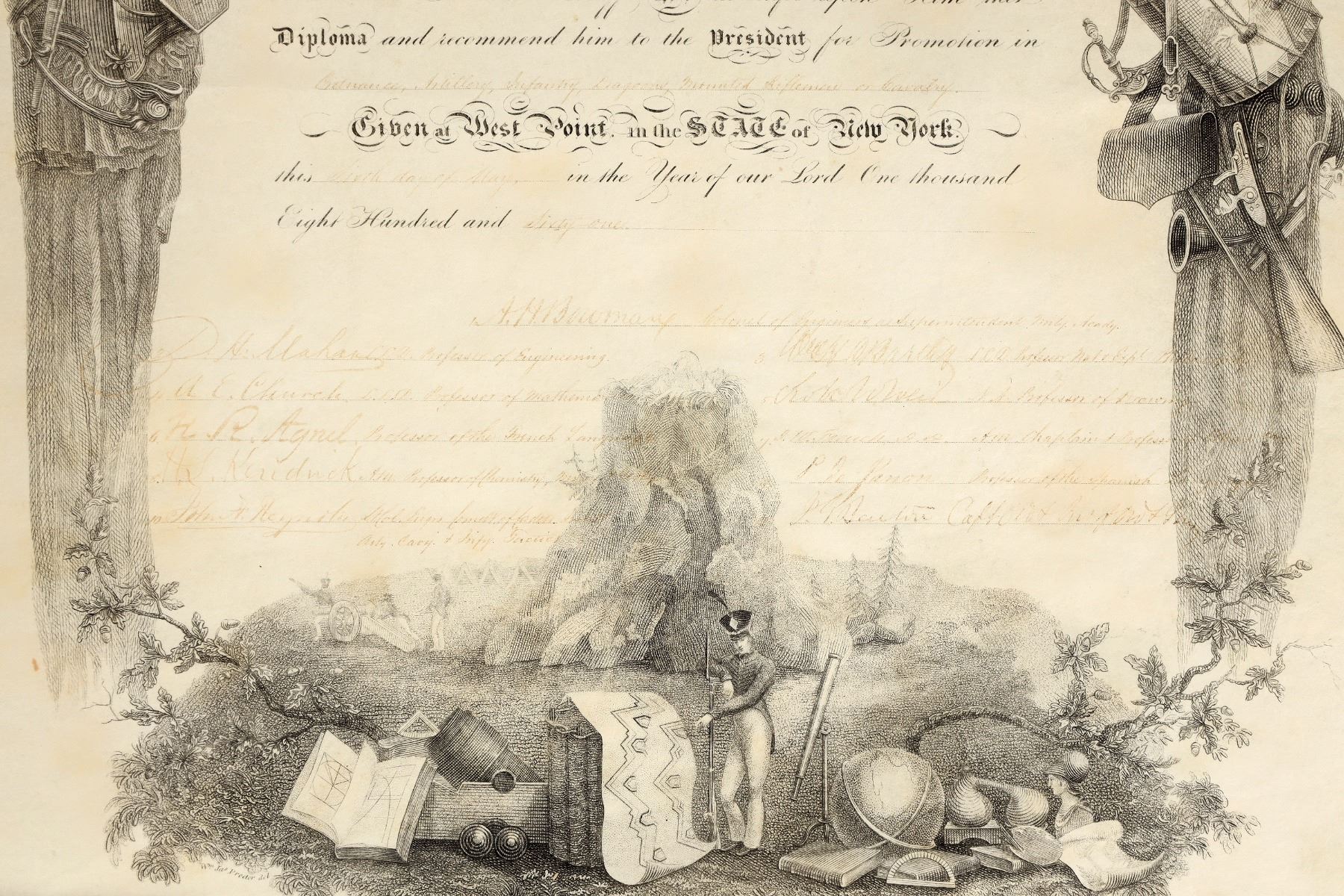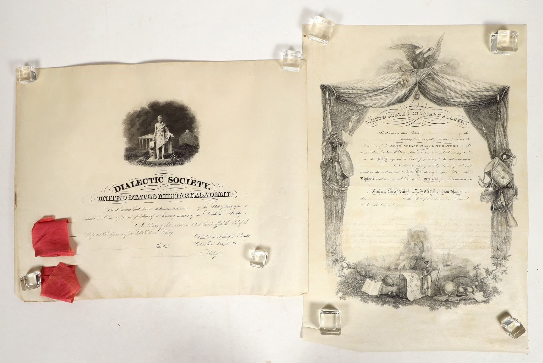 Lot of 2 different. 1) Diploma issued by the United States Military Academy to John Benson Williams on May 6, 1861. Signed by Alexander Bowman as supt., John Reynolds, as well as other faculty members. 22 x 15" Pen ink is faded. Reynolds was commandant of cadets at West Point. He was killed at Gettysburg. 2) Second document, also issued to Williams, is for a Membership in the Dialectic Society, United State Military Academy. 21 x 15" Signed by James P. Parker as president, who was the roommate of George Armstrong at West Point. Additional biographies included.