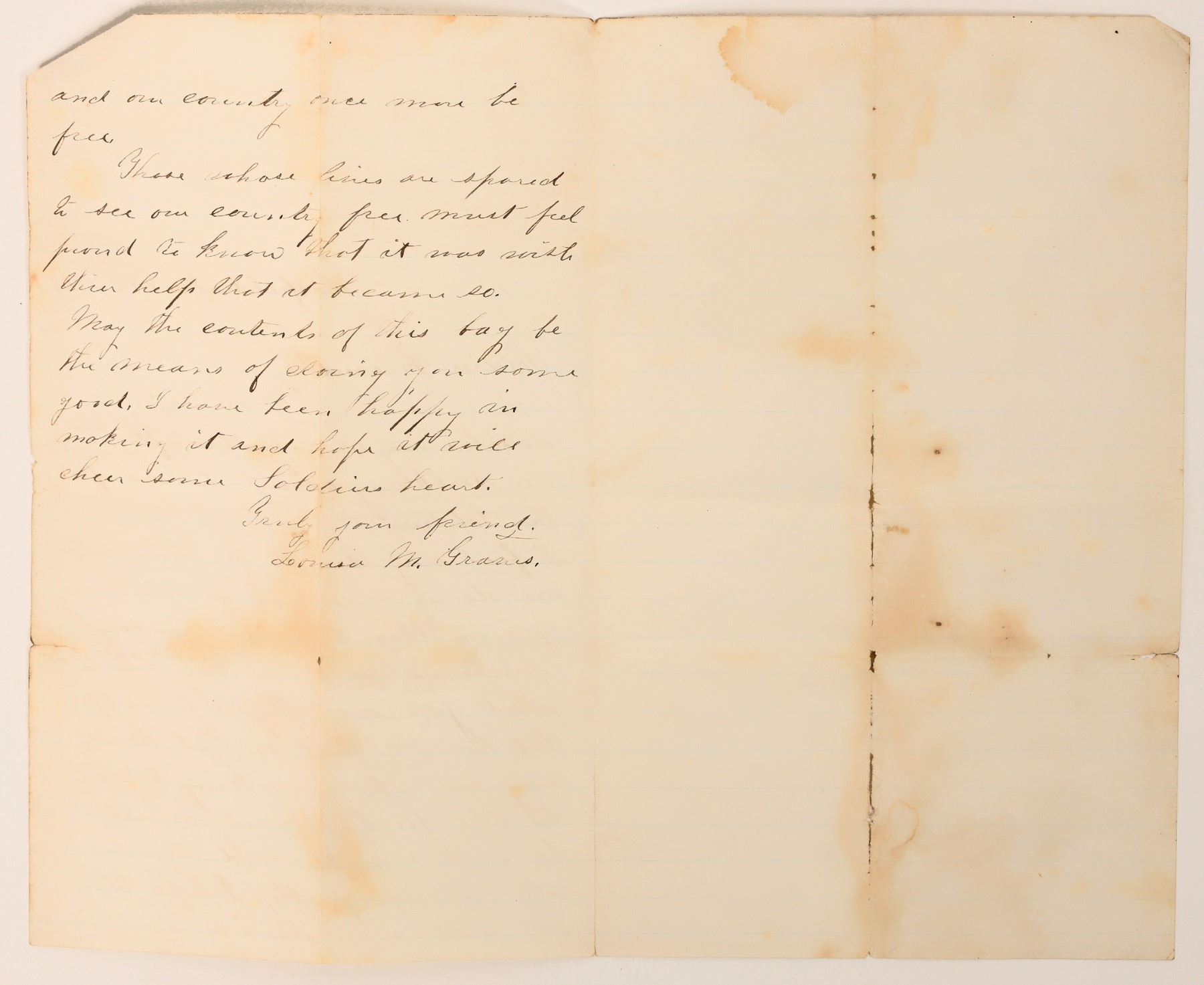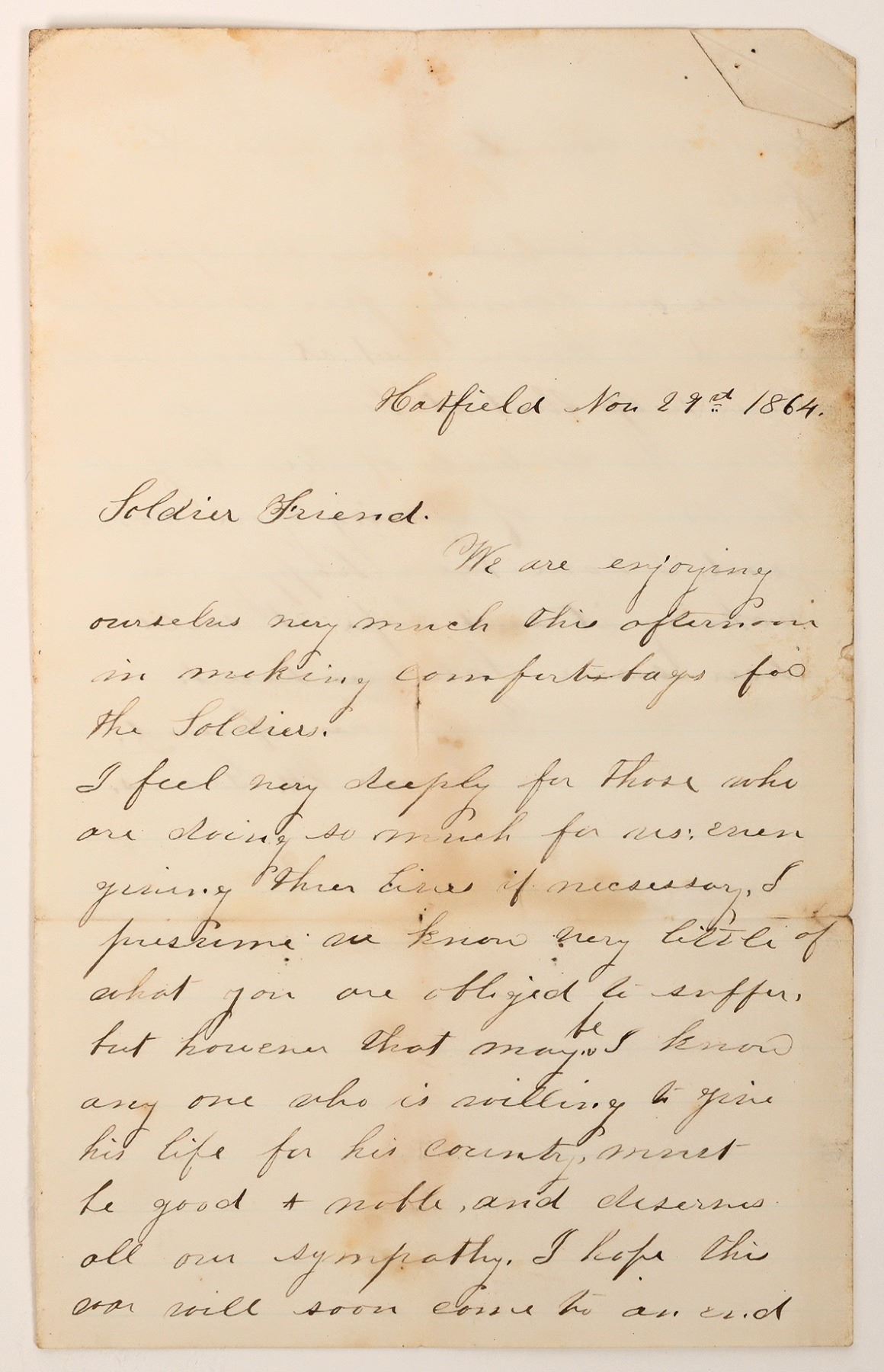 A letter from one Louisa M. Grams to an unnamed Civil War soldier, written in 1864 as part of a 'comfort bag' for the soldier. The letter is addressed from 'Hatfield', though no state is specified. Grams describes the enthusiasm of her and her peers in assembling the bags for the soldiers, their pride in the soldier's bravery, and her hope for success in the war.[ Hatfield