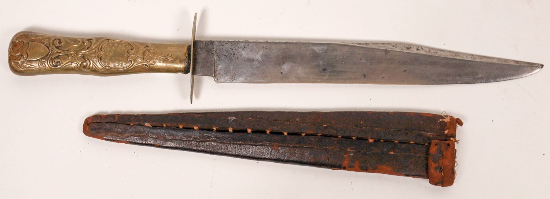 This side Bowie knife was made by Samuel Wragg of Sheffield, England marked "Saml. Wragg 25 Furnace Hill Sheffield" on the ricasso. The blade is 8. 25 in. long and the knife is 13 in. overall length. The hilt or grip is of brass with the Confederate Eagle displayed on both sides. The guard is brass. An original sheath is included. The knife is in very good condition while the sheath is delicate and in good condition. From the Kevin Hoffman collection. Please see photos for details. State: City: Date: Provenance: