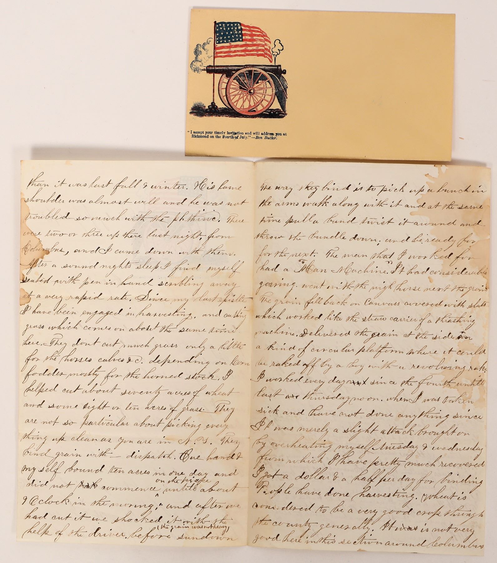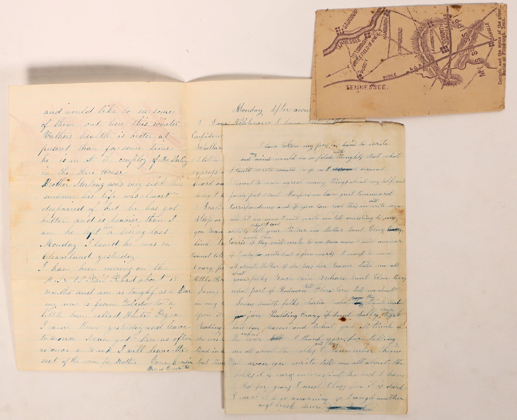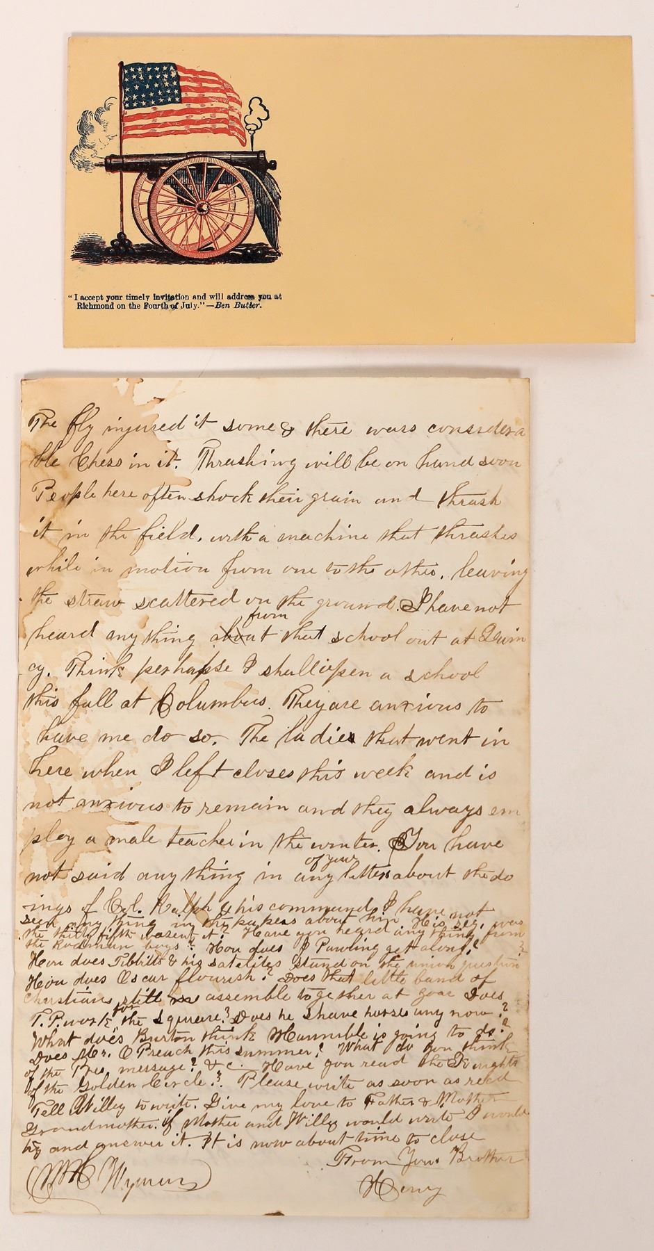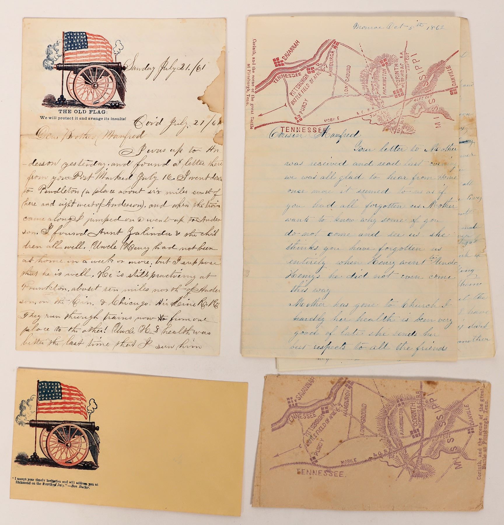 Two Civil War era letter sheets with matching unused covers, c1861-62. First is a letter dated July 21, 1861, with red, white and blue color illustration of the American flag flying next to a cannon. The sheet is printed in blue "The Old Flag: We will protect it and avenge its insults!" The cover is printed in blue below the illustration, "I accept your timely invitation and will address you at Richmond on the Fourth of July. - Ben Butler." The other letter sheet and cover have printed matching Civil War maps, illustrated with maps of Mississippi and Tennessee, with an arrow pointed toward "Battlefield of April 6-7." The cover in purple ink and letter sheet in red ink, each with "Corinth, and the scene of the great Battle at Pittsburgh, Tenn." printed next to the map. Letters contain family information.
