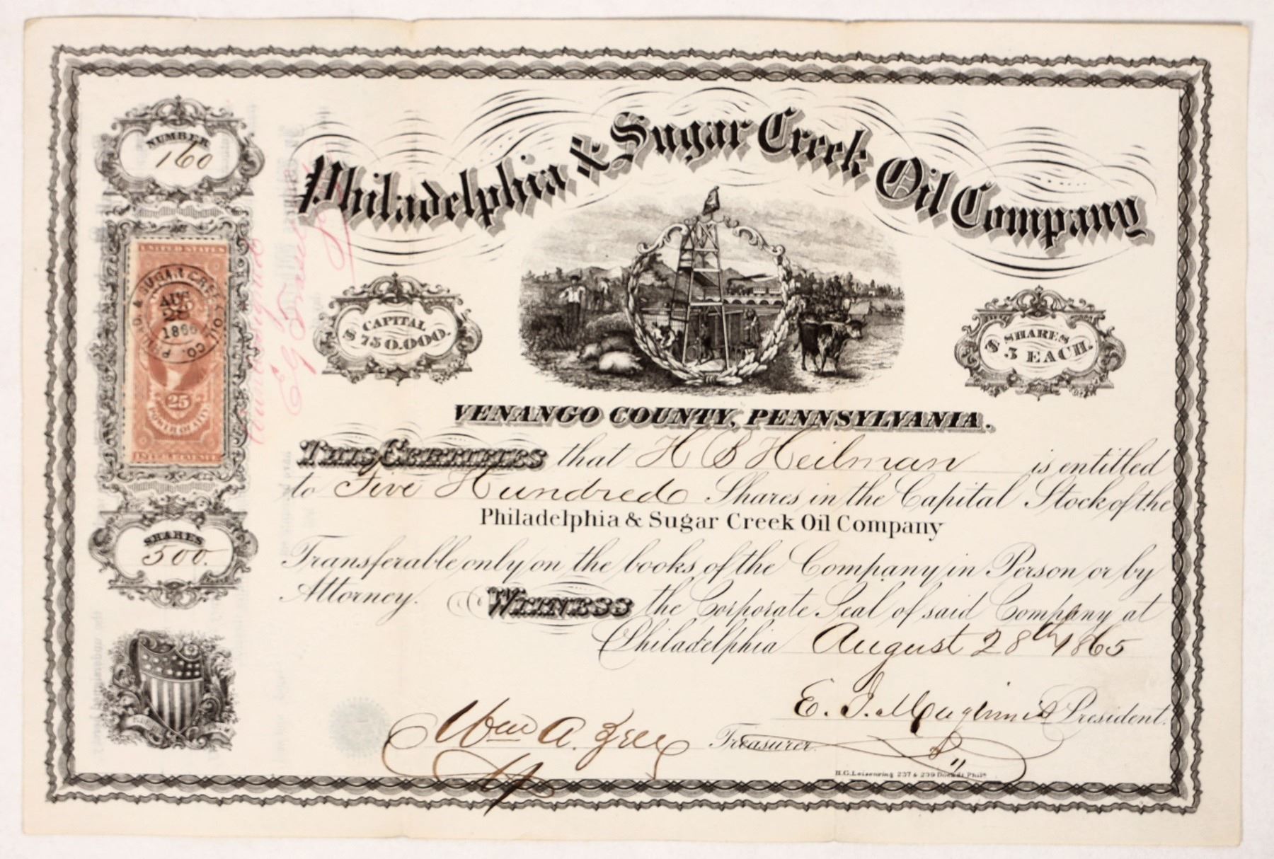 A stock certificate for 500 shares in the Philadelphia & Sugar Creek Oil Company made out to H.B. Heilman in 1865. No. 160 issued. "Venango County, Pennsylvania" printed under vignette. Signed by both secretary and president (signatures illegible); embossed company seal at lower left. 25¢ IR Power of Atty. stamp in stamp frame at left. Beautiful vignette with both agricultural and oil imagery. Some creasing, otherwise great condition.