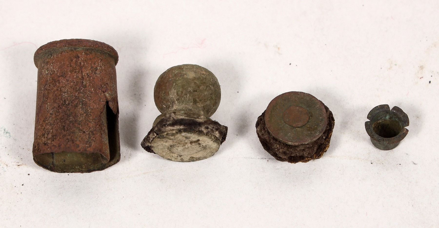 This Riker box contains metal finds from the Gettysburg Battlefield. There is a buckle from a leather strap, a .58 cal. mini-ball, a hook loop with stud, a large bore metallic cartridge, a discharged musket cap, and two studs from leather pouches. Please see photos for details.