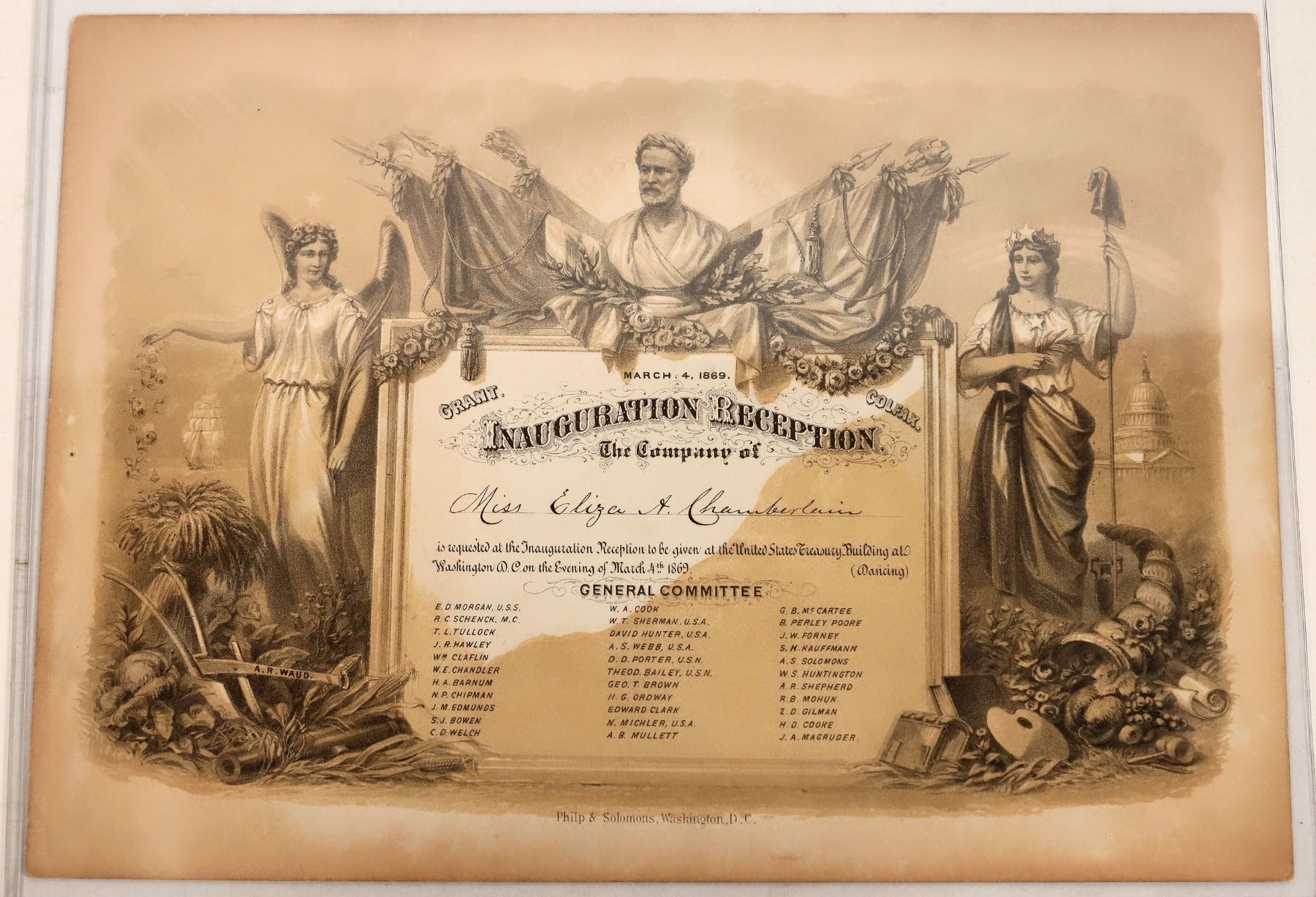 This is a formal invitation to President Grant's Inauguration made out to Miss Elisa Chamberlain dated for March 4th, 1869. Roughly 7 in. X 10 in. Printed by Philp & Solomons, Washington D.C. The vignette depicts Grant in the center flanked by two lovely ladies Peace and Plenty. The document appears stained but is printed in this two color format. In very fine condition.