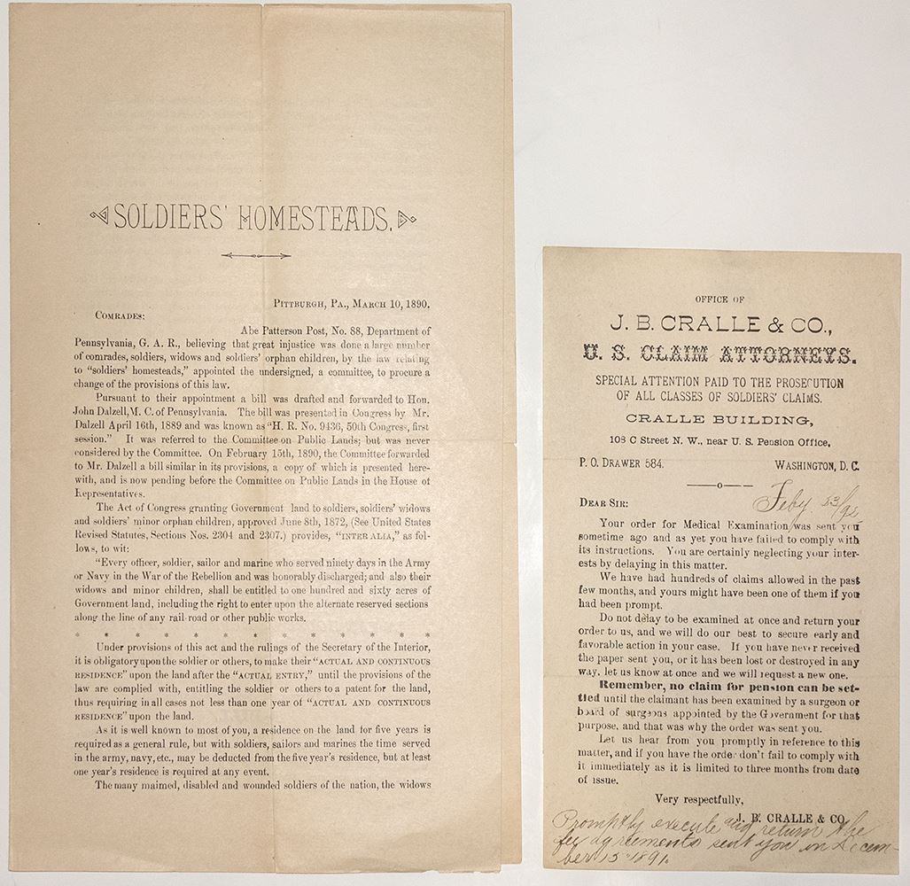 One handbill addresses Soldiers', widows and minor orphan children rights to Homesteads, about a pending bill in congress. The other is from the office of J. B. Cralle & Co., U. S. Claim Attorneys (Special attention paid to the prosecution of all classes of soldiers' claims).