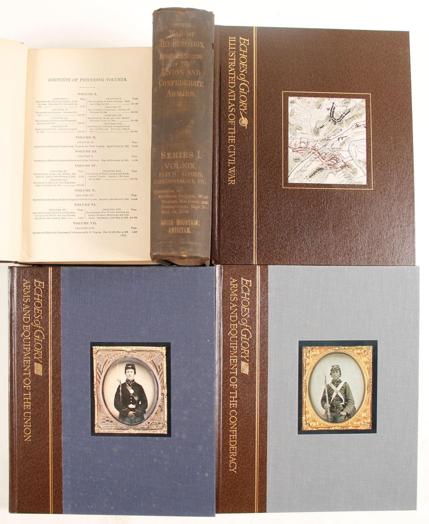 War of the Rebellion, Official Records of the Union and Confederate Armies, Series I Vol. XIX Part 2, 821pp with index, Series I Vol. Part 1 1215pp with index-approx half of pages has top dogears and upper rear cover is corner dented. 3 volumes of Time-Life Echoes of Glory- Arms and Equipment of the Confederacy, Arms and Equipment of the Union, Illustrated Atlas of the Civil War. City: State: Date: