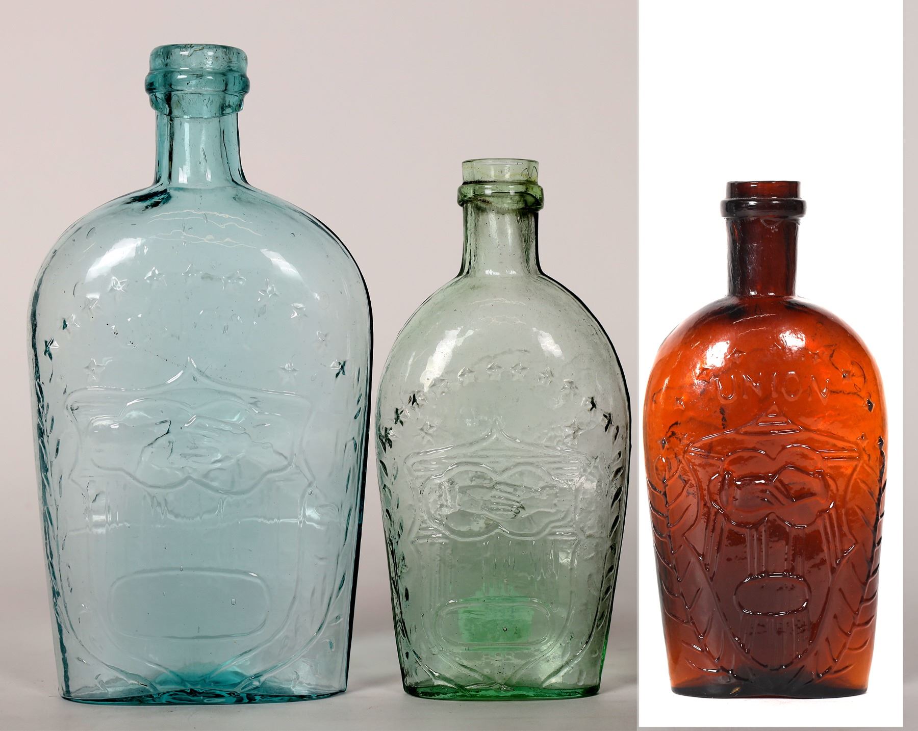 1.) Amber half pint Union / Clasped hands in shield // Right facing eagle over shield. 6" tall. no pontil. applied top. no apparent problems. 2.) Aqua pint. 11 stars on top / Union / 2 stars / clasp hands in shield with blank slug plate // cannon facing right US flag behind on top of 6 cannonballs. no pontil applied top problem free. 3. half pint, 6 3/8" similar to #1 above, light greenish aqua, smooth base. appears problem free. Ron Reed collection