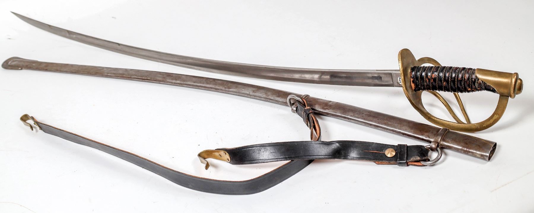 This is a model 1860 Cavalry saber at 42 in. length. No markings on the ricasso, two piece guard and pommel. Scabbard has some dents. The grip is wire wrapped black leather in fair condition. There are two rings with late leather straps.