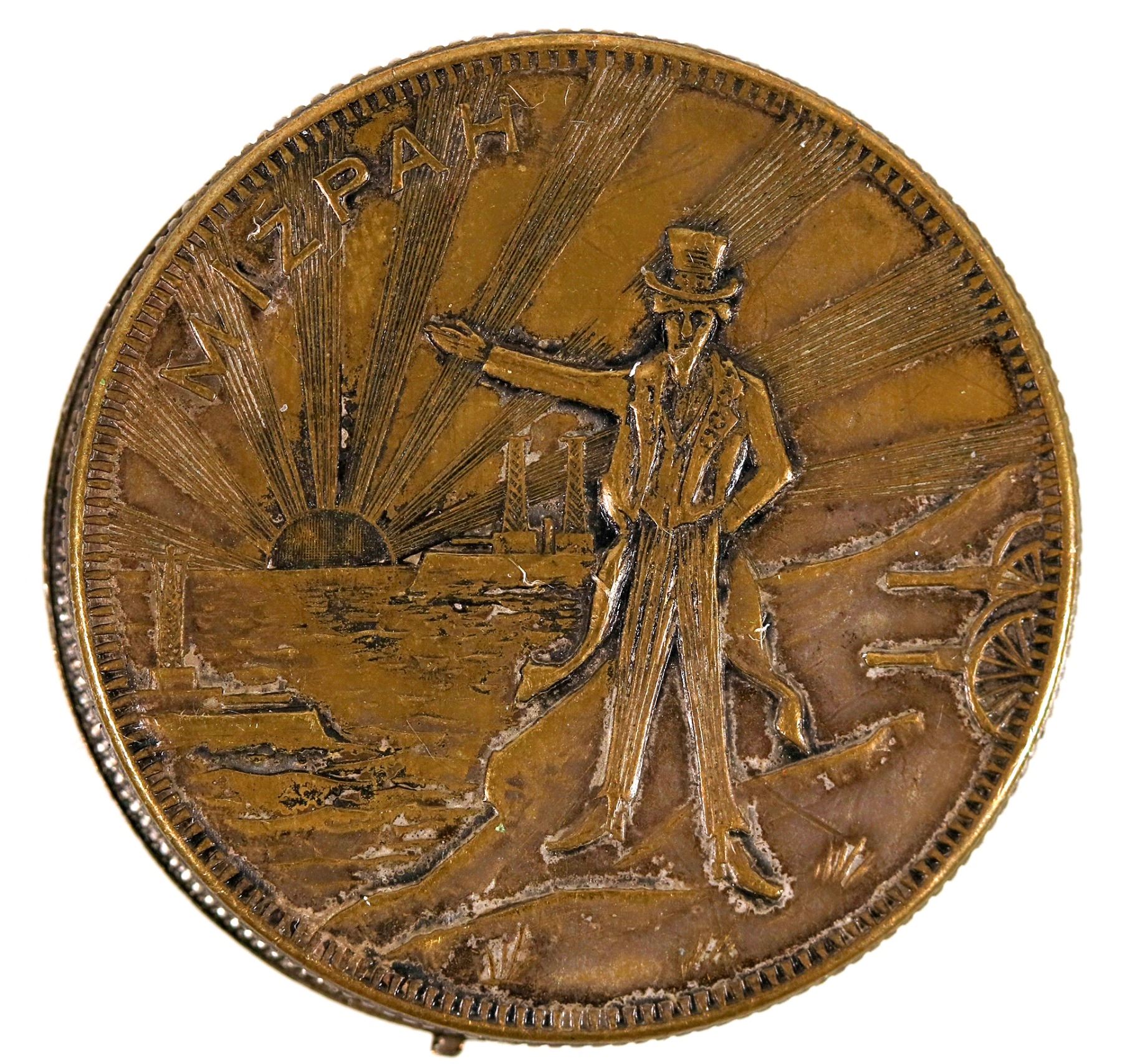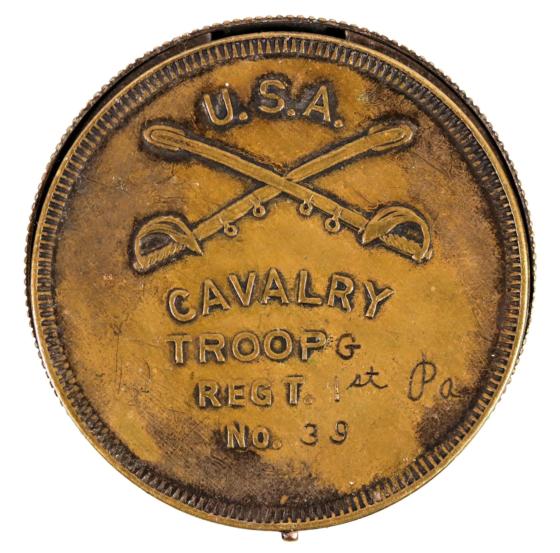 Interesting Civil War medallion (37 mm) which opens like an "opium dollar" to hold a picture or message of a loved one. 1st Pennsylvania Cavalry Troop G No. 39 on obverse. Uncle Sam on battlefield with cannon pointing to the rising sun on reverse. Also "Mizpah", the Jewish term for bond between two people. The 1st Pennsylvania cavalry had a number of Jewish soldiers and was active July 1861 to June 1865. They participated in over 30 engagements including Bull Run and Gettysburg under Brigadier General G. D. Bayard who was killed in the battle of Fredericksburg.