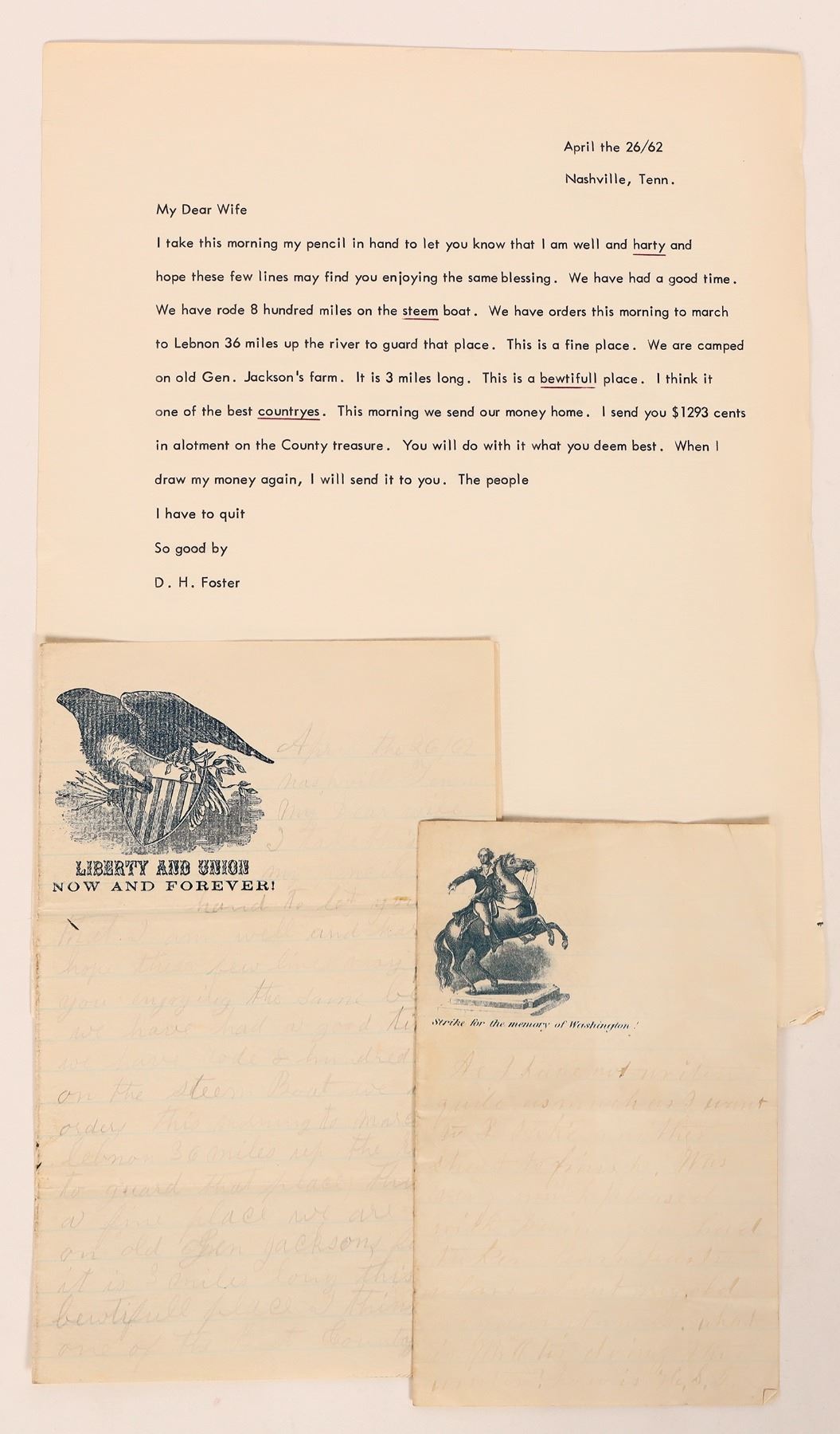 1862 Liberty and Union Now and Forever! folded letterhead-we rode 800 miles on a steamboat and will march to Lebnon 36 miles up the river, 7.75x5". Strike for the Memory of Washington folded letterhead with faint mostly illegible ink, 6x3.75".