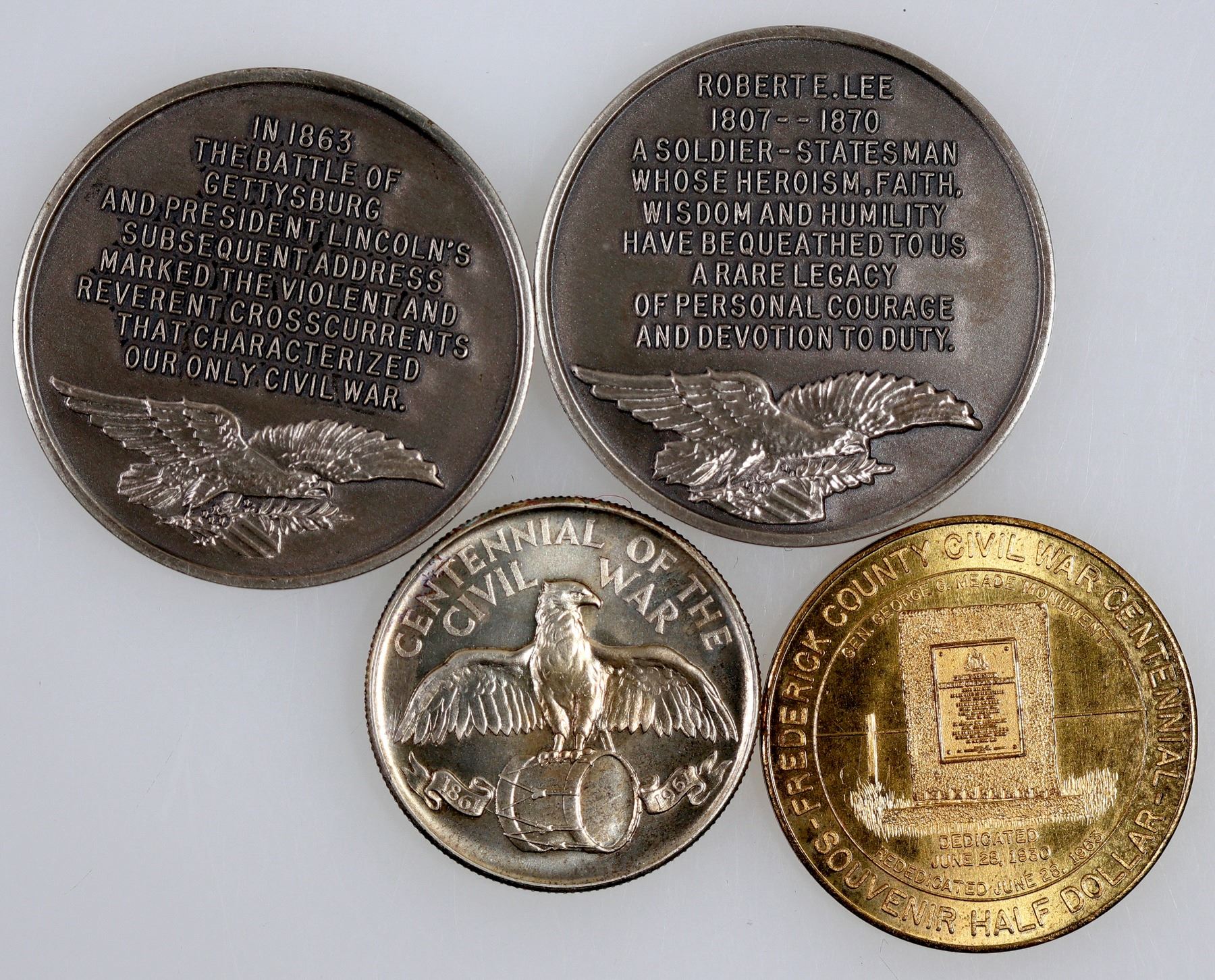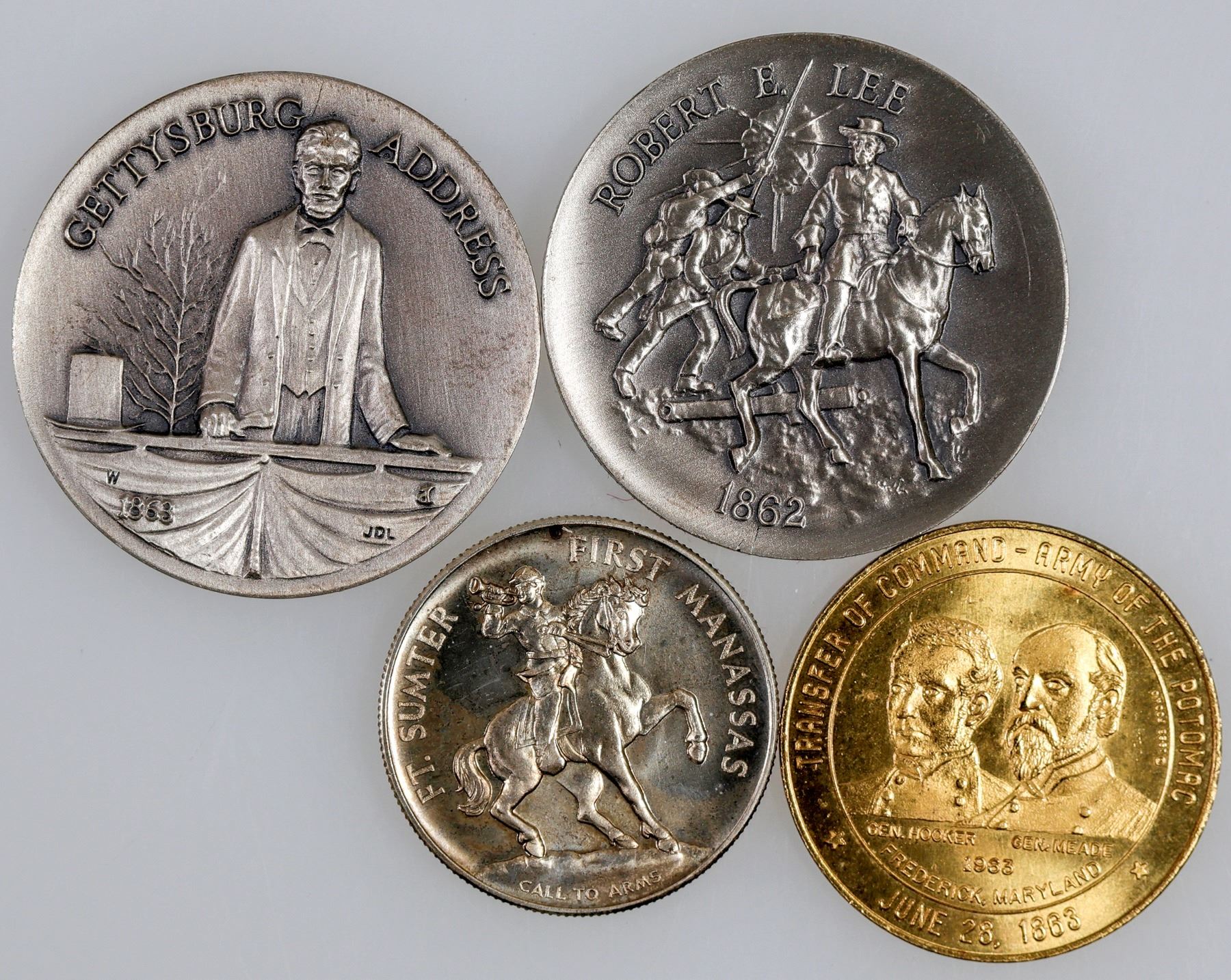 Four medals of the Civil War, three silver: Heraldic Art Civil War Centennial 1961; Longines Symphonette Gettysburg Address; Longines Symphonette Robert E. Lee; 1963 Transfer of Command Army of the Potomac Centennial (brass).