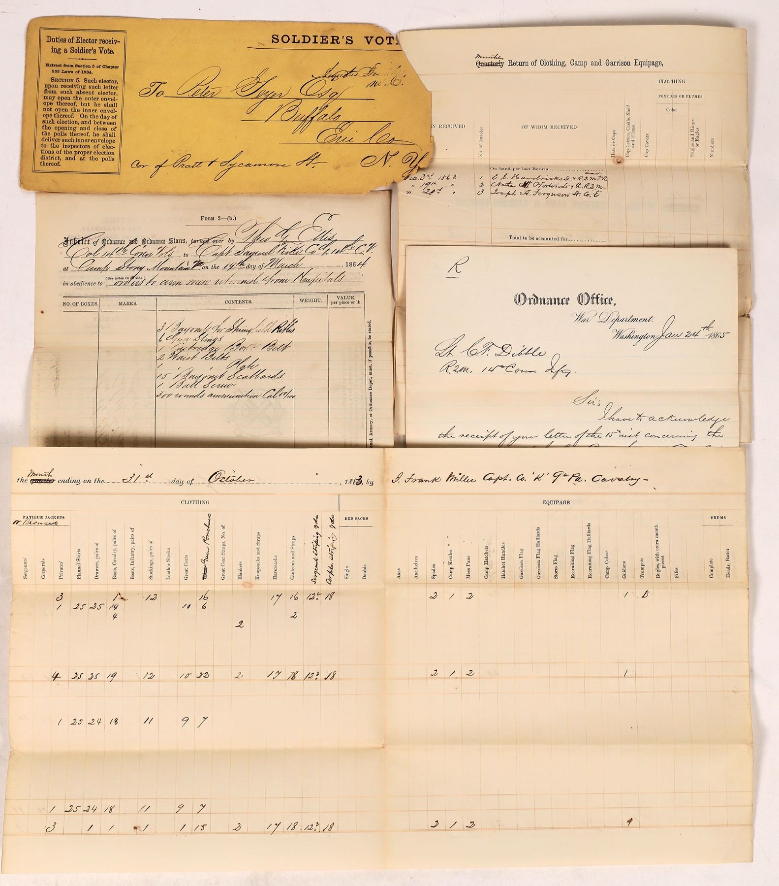 The first document is from the Ordnance Office to Sergeant C.T. Dibble regarding the return of property of Capt. Samuel Fisk of the 14th Connecticut Infantry having Died on May 22, 1864 from wounds sustained in battle. The letter is dated Jan. 24, 1865. Another document for Ordnance Stores to outfit men from Theodore Ellis to Capt. Samuel Fisk while at Stoney Mountain, Virginia a winter camp dated March, 1864 two months before his death. The 14th Connecticut Infantry saw many battles and sustained some of the worst losses of that war. Capt. Fisk was captured and sent to Libby Prison and later released in a prisoner exchange. From the 9th Pennsylvania Cavalry are two invoices made by J. Frank Miller Captain of Co. "K" 9th Cavalry for clothing and a shelter tent while "in the field" dated Oct. 31, 1863. The Pennsylvania 9th is remembered for joining General Sherman's March-to-the-Sea campaign and being on-hand for the surrender of General Johnston (confederate) at the Bennett Place in North Carolina.
