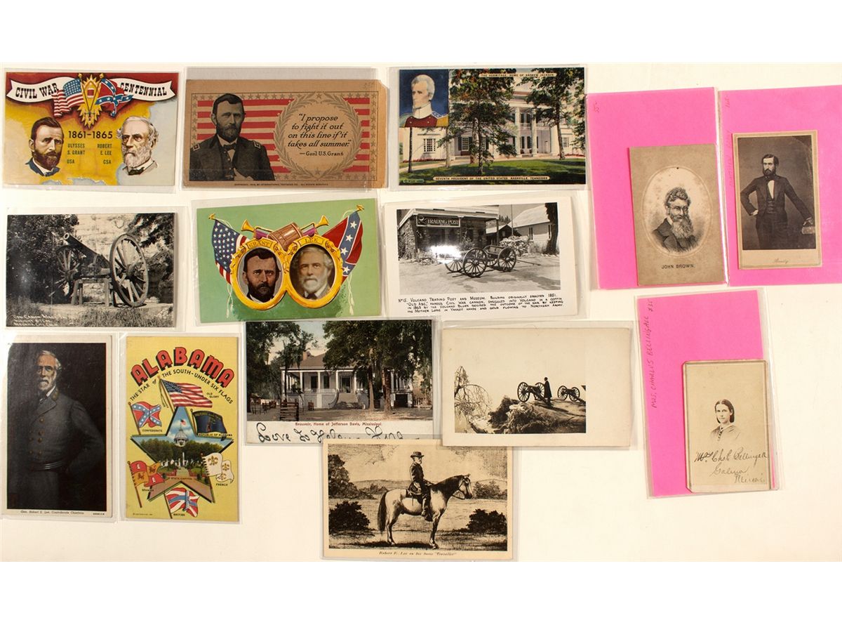 Lot of 14 pieces. CDVs: Matthew Brady, Mrs. Charles Bellinghall, and John Brown. Postcards: two printed cards with Grant & Lee, three with CW cannons (Nevada City, Volcano, Chattanooga), and four with Confederate themes (Alabama, Lee on his horse, portrait of Lee, home of Jefferson Davis), and one showing Andrew Jackson's home in Nashville. Finally, a patriotic piece c.1915 featuring quote and picture of U.S. Grant. Prag Collection