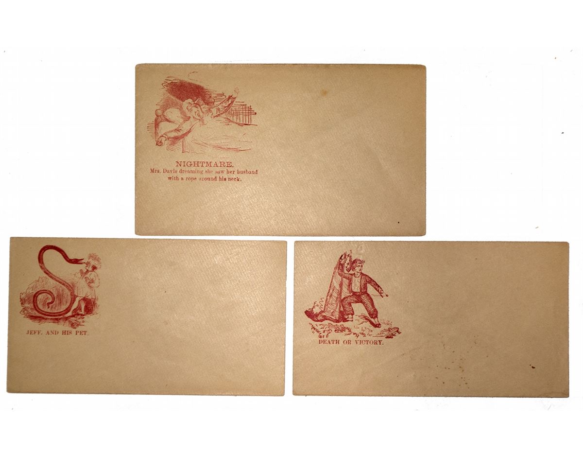 Three unused, pictorial, political Civil War envelopes: "Jeff. and His Pet" (crazy looking man confronting a snake); "Death or Victory" (man holding up American flag); and "NIGHTMARE. Mrs. Davis dreaming she saw her husband with a rope around her neck" (older woman in bed). Red vignettes and fonts. 3" x 5" with light toning.