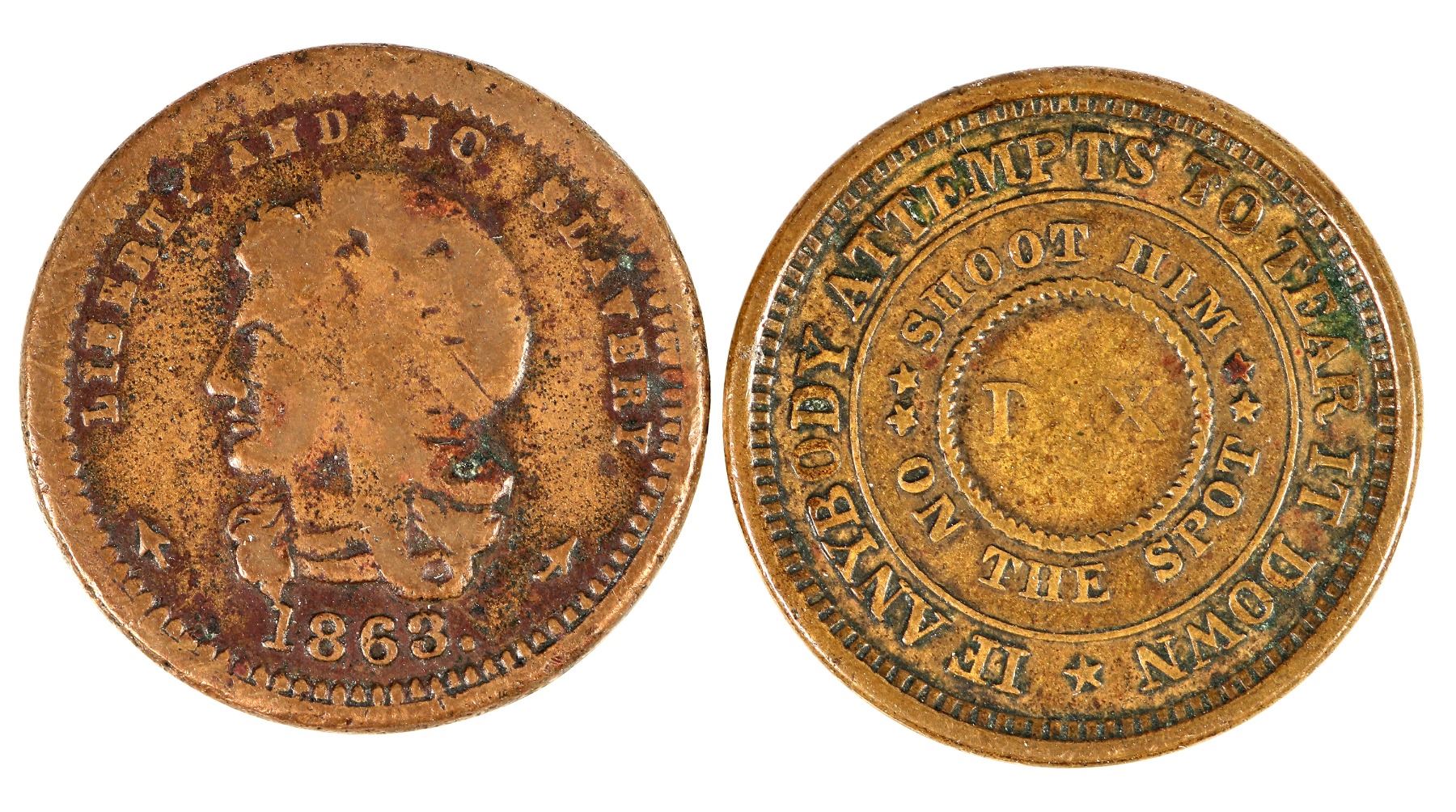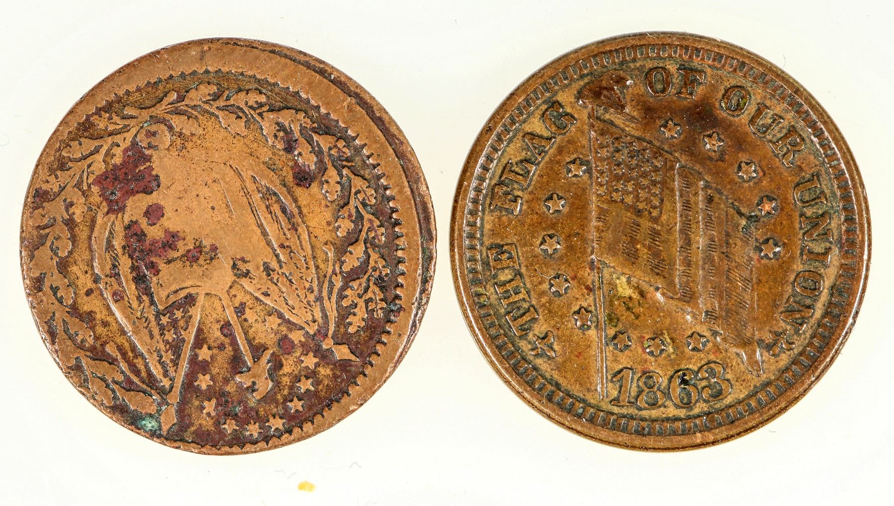 Two political 1863 tokens: 1) The Flag of Our Country / 1863 // If Anybody Attempts To Tear It Down / Shoot Him / On The Spot / D I X; Br., rd., 19 mm. 2) Liberty And No Slavery / 1863 // (shield and flag); Br., rd., 19 mm.