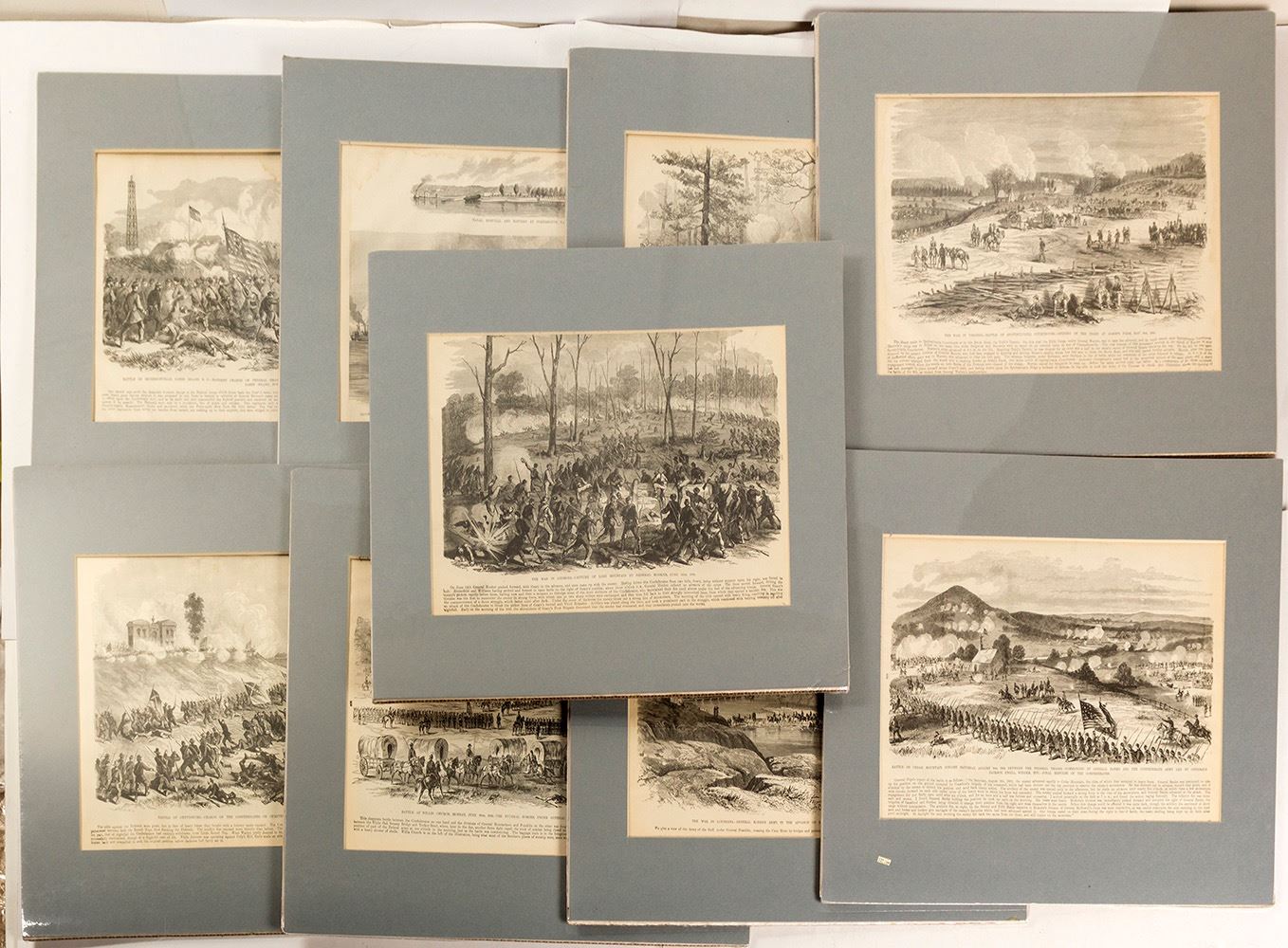 Nine different vintage Civil War prints: Battle of Gettysburg; Battle of Secessionville, James Island; Naval Battle in Hampton Roads; Battle of Bentonville, N. C.; Battle at Willis Church; The War in Louisiana; The War in Georgia; The War in Virginia; Battle of Cedar Mountain. All prints are matted 16" x 20". Date: Location: HWAC# 56861