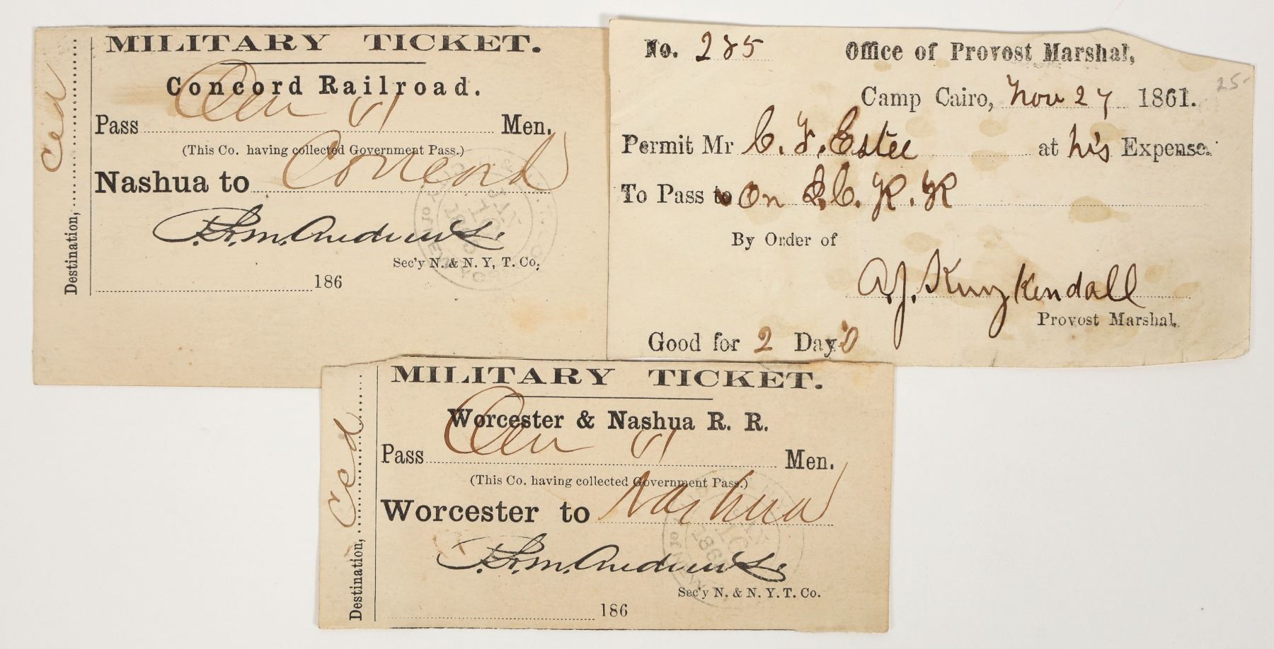 Lot of 3. Rare Civil War RR passes. Two "Military Ticket' : one for the Concorde RR, Nashua to Concord And one for Worchester & Nashua RR Worchester to Nashua. Both are stamped by N.Y.T Jan 16, 1863 or 65. The last number is obscured. Last pass is "Office of the Provost Marshal", Nov. 29, 1861 Camp Cairo. Camp Cairo was a refugee camp for those escaping enslavement. All are in VG or better.