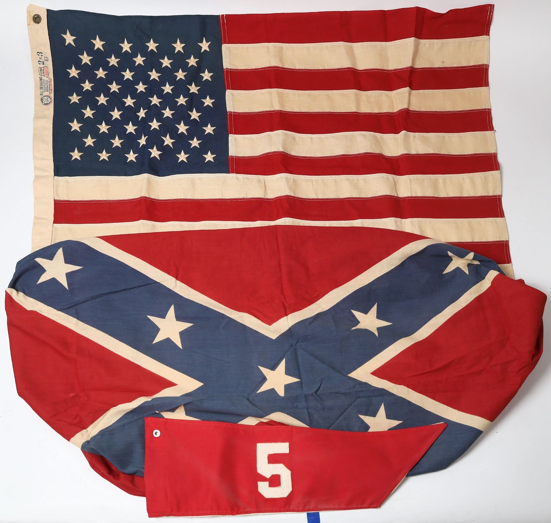 This lot contains enough flags to outfit a Civil War reenactment. There is an American flag with 50 stars at 2ft. X 3ft. by Bull Dog Bunting sewn stars and stripes. A Confederate flag 3ft. X5 ft. silk screened, a C 2 red and white guidon flag 16in. X 23in.