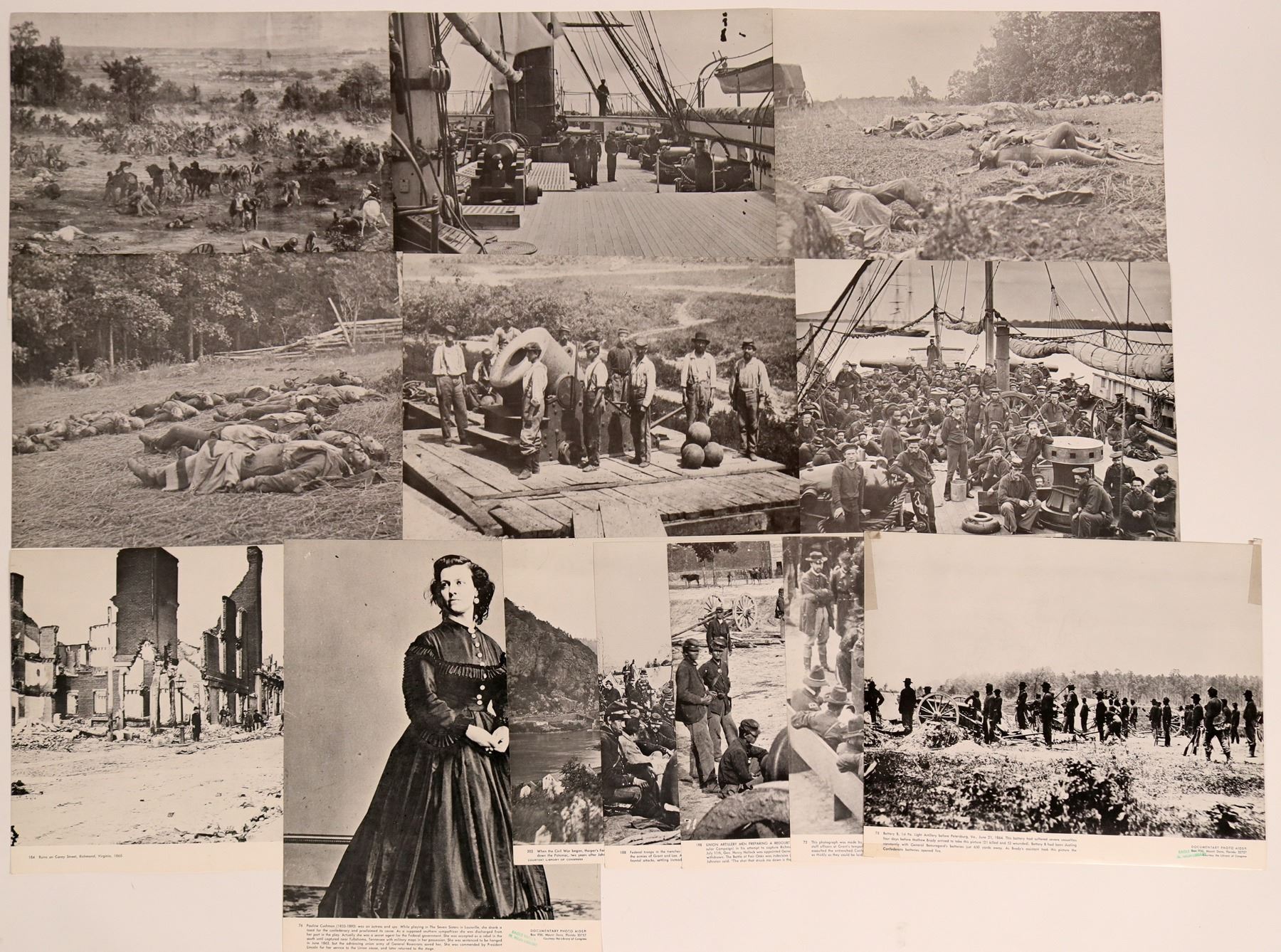 Glossy black and white photograph reprints chronicling the Civil War, each numbered with a caption describing the scene. The measure approximately 11" x 14". Reprinted by Documentary Photo Aids, Mount Dora, Florida Courtesy of the Library of Congress. One photograph has ink doodles on reverse and scotch tape on edges. Otherwise all are in excellent condition. Green stamp on bottom right corners from Eagle Valley Junior High School Library.