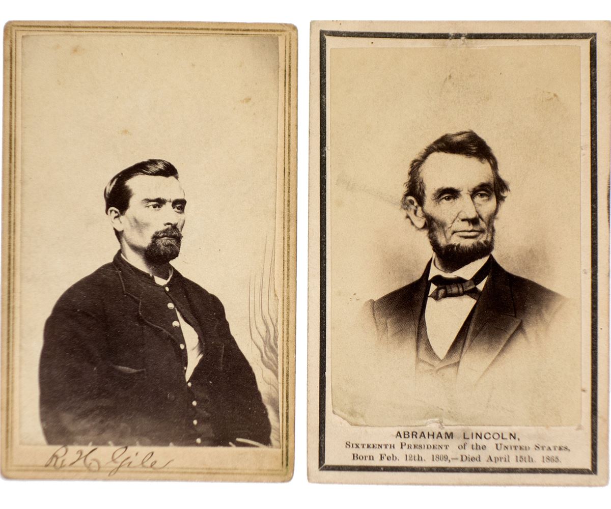 Lot of 2. 1) CDV size sketch portrait of Abraham Lincoln published by The New York Photographic Co., No. 453 Broadway, New York. Has dates of his birth and death. Small tears to bottom. 2) CDV of Ransom H. Gile, Co. K, 4th V.R.I. Photographed by P.B. Jones, Cor. Second and Main Streets, Davenport, Iowa. Has two cent adhesive revenue stamp attached. Good contrast, minimal wear.