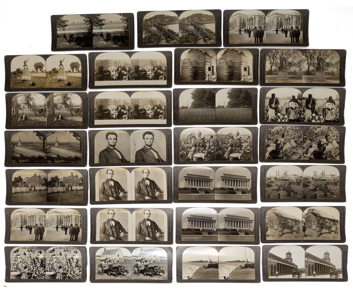 Lot of 27 Keystone View Company stereoviews that feature views of Civil War sites, Southern scenes (slave related), and Abraham Lincoln (portraits and monuments). Some duplicates. Includes: Chickamauga Park, Tenn.; Gettysburg, Pickett's Famous Charge monument; Gettysburg, Little Round Top; Gettysburg, General Lee's Headquarters; Confederate Capitol; Harper's Ferry; Old Slave Market, Richmond; Fort Sumter; Cotton plantation; Uncle Tom's cabin; cotton on river steamboat, New Orleans; Lincoln and his cabinet; earliest portrait of Lincoln, etc. Overall good condition.