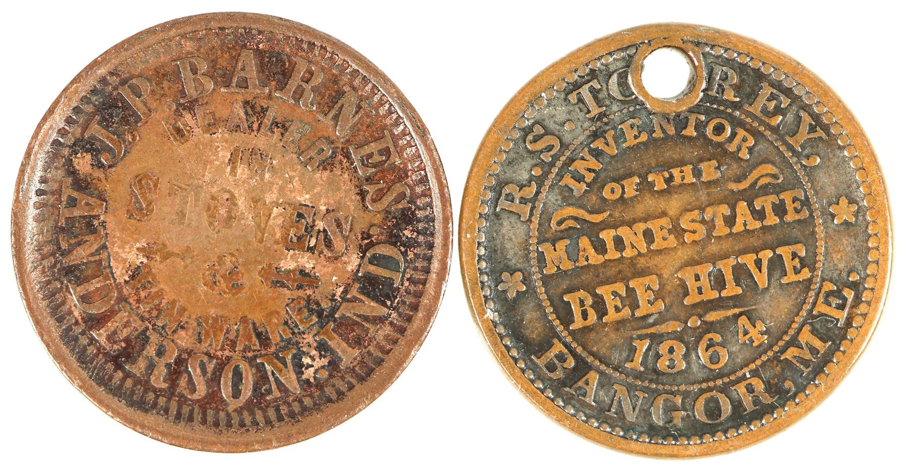 Lot of two: 1) R. S. Torrey / Inventor / Of The / Maine /State / Bee Hive / 1864 / Bangor, ME; Fuld 100A -2a / 1200; V-EF, holed, R4. 2) J. P. Barnes / Dealer / In / Stoves / & / Tinware / Anderson / Ind.; Fuld 20A-1a; G-VG, worn in center; R4.