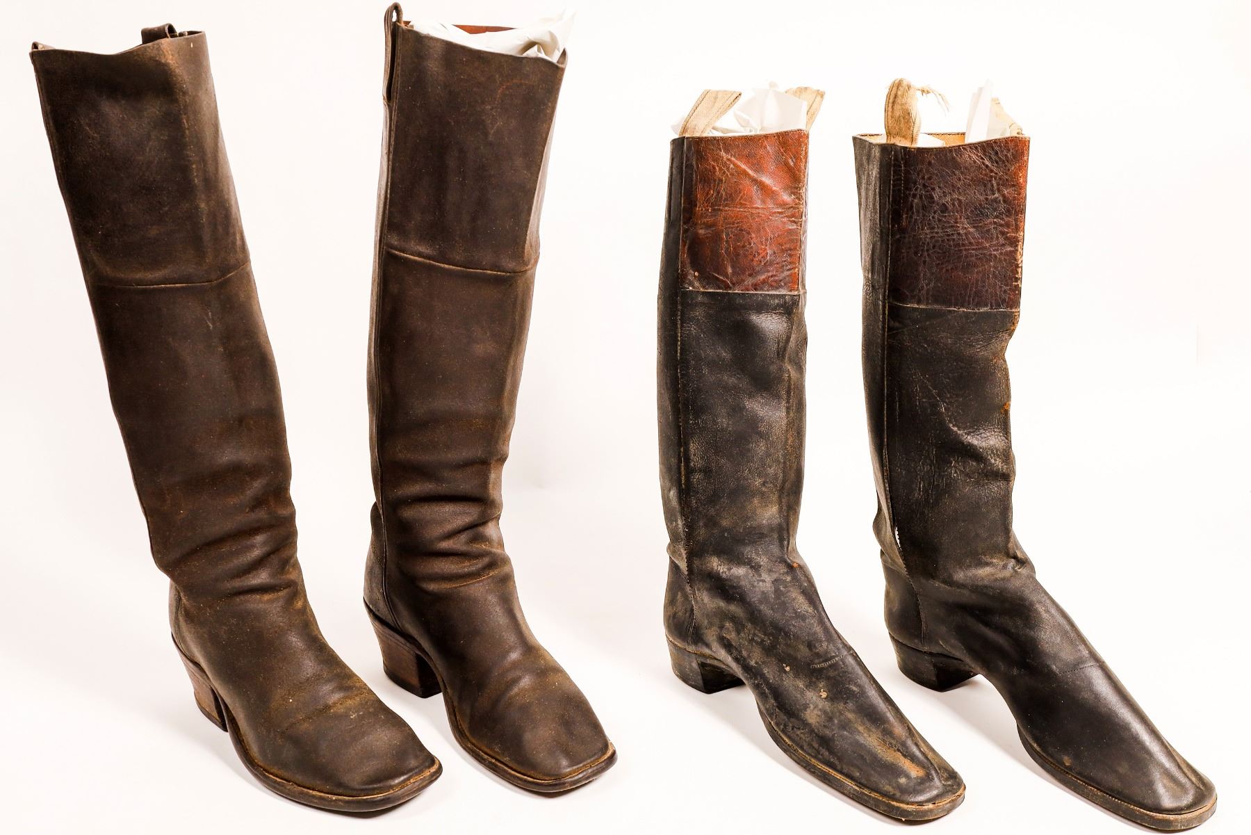 Two pair of unmarked stove pipe boots that appear to pre-date the classic 1870s cartouched boots. The first pair appear to be vintage and original Civil War stove pipe boots with striped cloth pullups from the inside. The stripes are pink (may have been red) with white and blue thread on the outside. One boot has "T.S.xx" in old brown ink. About 17" tall.