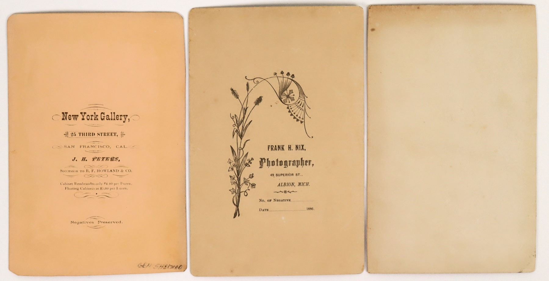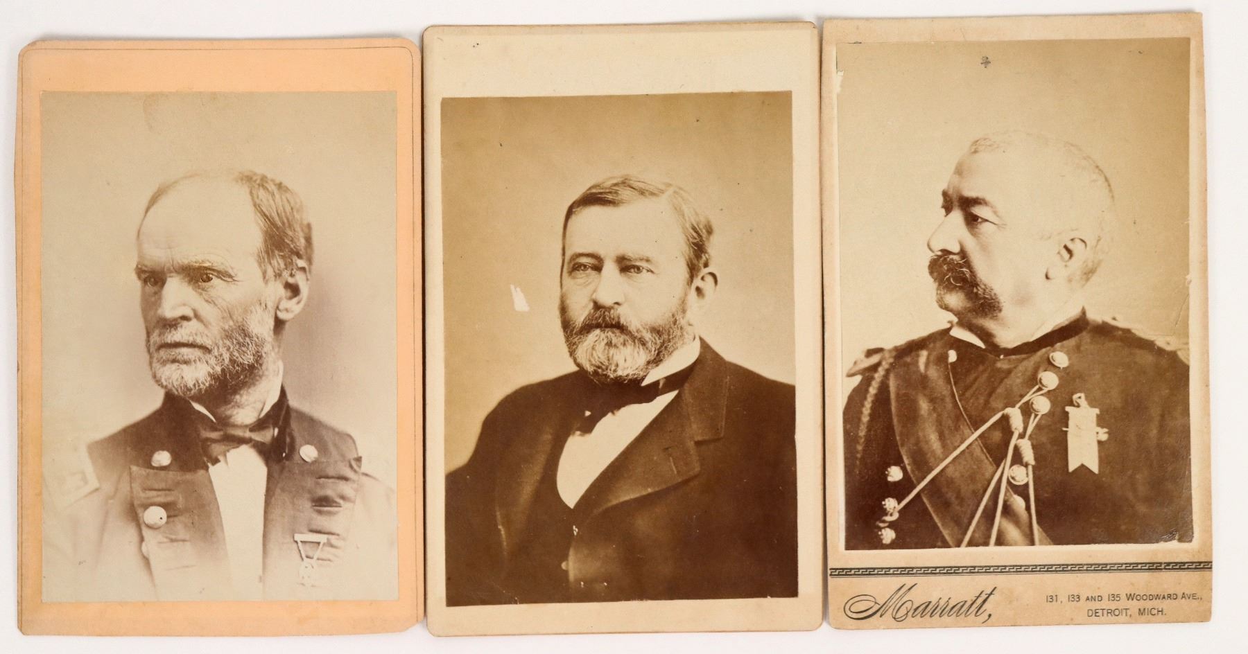 Lot of 3 Cabinet Cards of Great Civil War Generals. 1) General Phil Sheridan; Marratt 131, 133 and 135 Woodward Ave. Detroit, Mich. 4 x 6.5 inches. 2)General Ulysses S. Grant; Frank H. Nix, Photographer, 49 Superior St. Albion< Mich. 4.5 x 6.5 inches. 3) General Tecumseh Sherman; New York Gallery 25 Third Street, San Francisco, Cal. J. H. Peters, Successor To B. F. Howland & Co. Cabinet Rembrandts only $4.00 per dozen, Floating Cabinets at $5.00/dozen, Negatives Preserved. 4.25 x 6.25 inches.