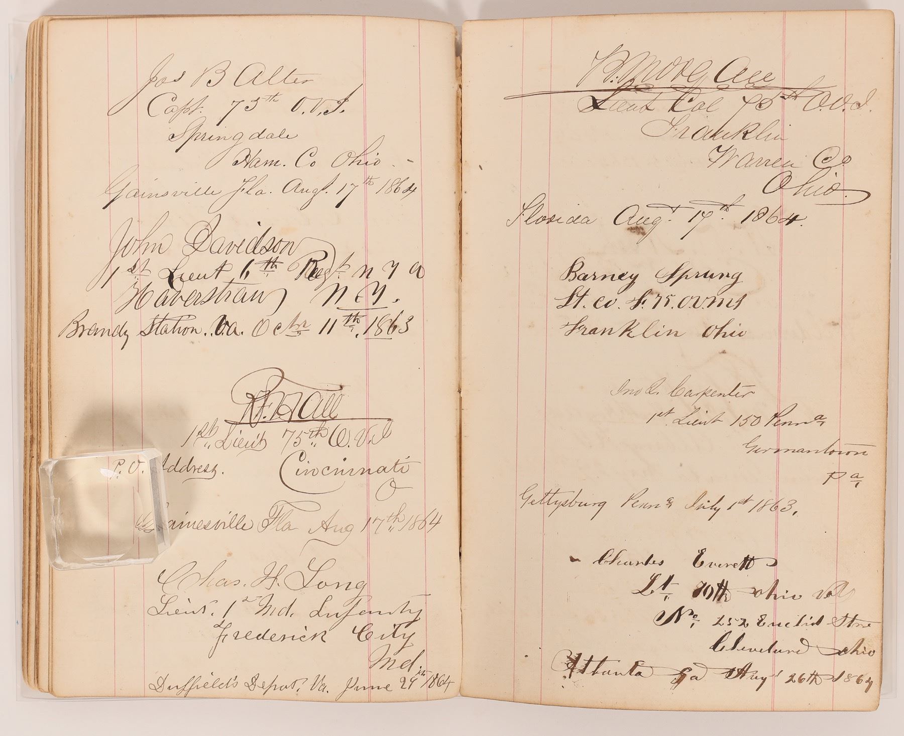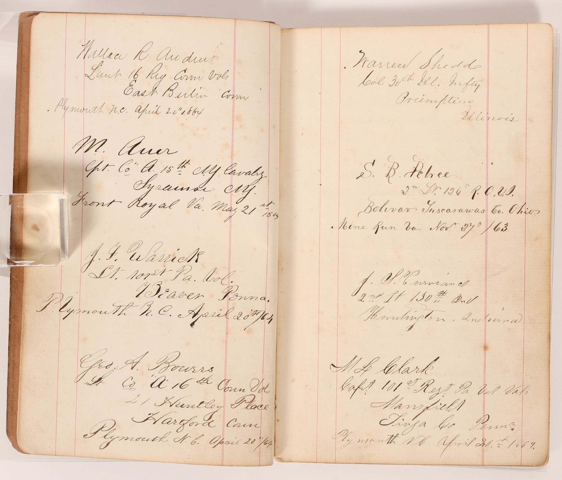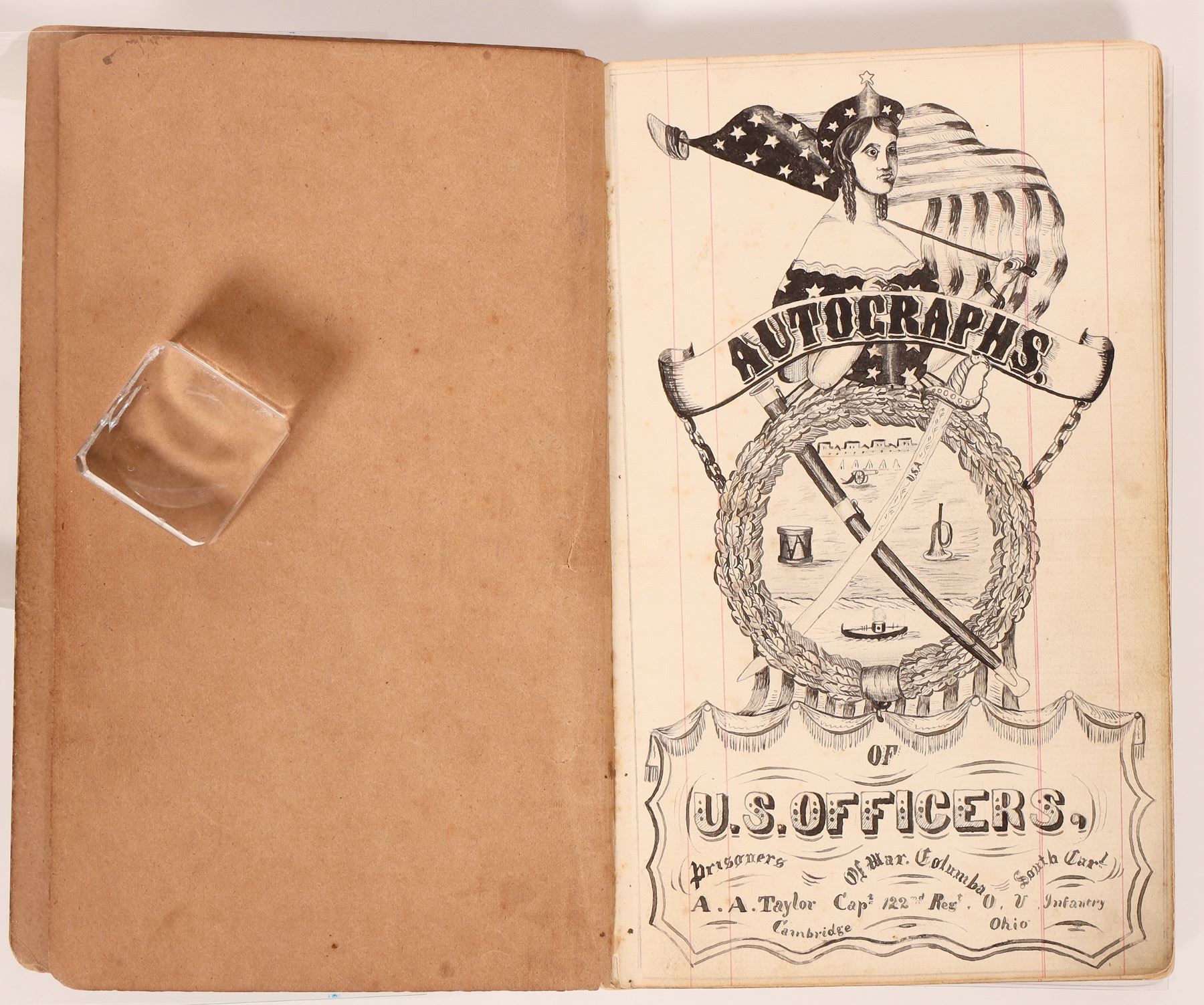 Exceptional historical record of Prisoners of war at Columbia, South Carolina compiled by A.A. Taylor, Captain, 122nd Reg, Ohio Volunteers of Cambridge Ohio. The book contains more than 470 autographs of Union officers with identifying regiments and other anecdotal material. The frontispiece is nothing short of fantastic- a professionally and very artistic hand drawn (black pen & ink) of Lady Liberty with an "Autographs" banner above a detailed wreath containing a Monitor, drum, bugle and cannon. Pages generally contain about four names each, sometimes five, rarely more. The men are all Union officers, though on close inspection I did not spot any generals. The dates range from July of 1863 to late 1864 and probably include many men transferred to this South Carolina prisoner camp from other sites. Each has written the record in his own hand, inclusive of their site of capture and their home town. This is very apparent, and may be the underlying purpose of the book - to document the Union officers in case something happens to them. Many were captured at Gettysburg in the first three days of July 1863, in which approximately 50,000 soldiers were killed. The contents of he book have not been published to our knowledge, and should be. Example: "David Wiston, Capt. 15th Mass Vols, Boston, Gettysburg, July 1, 1863"_x000D_