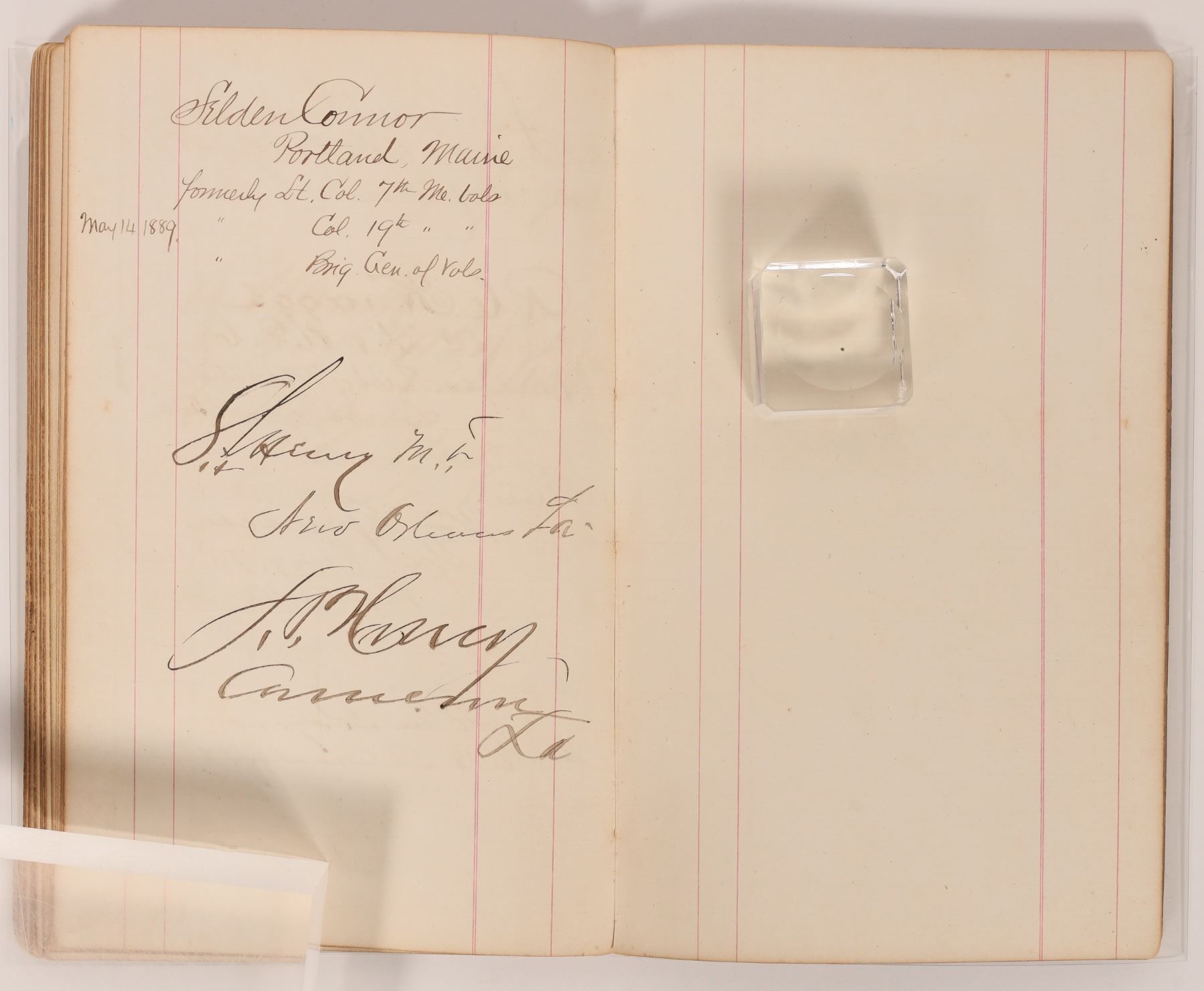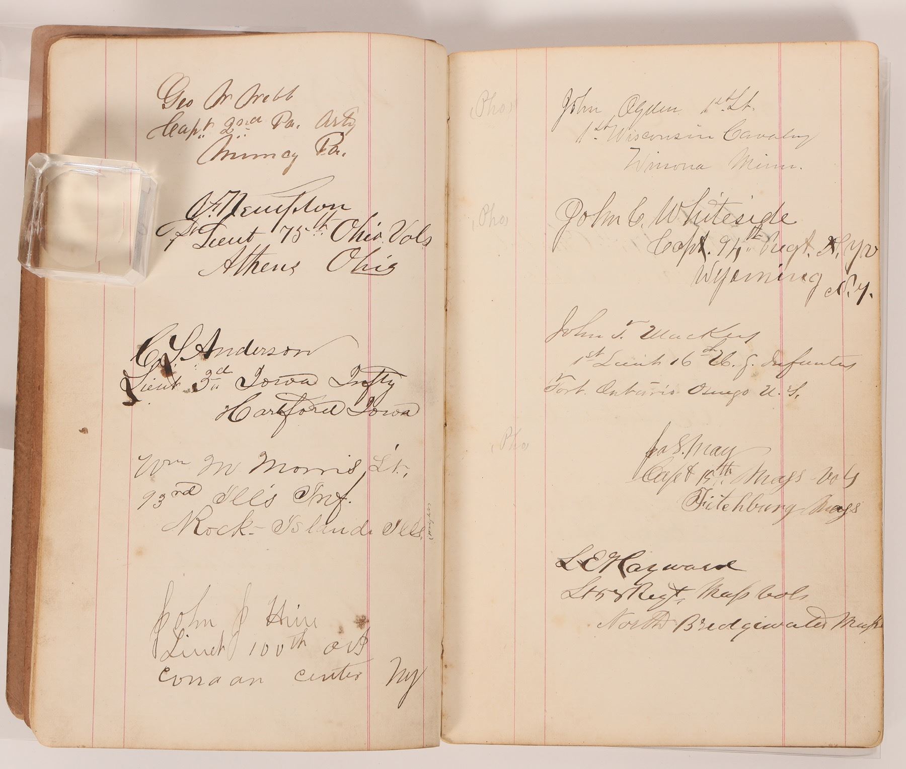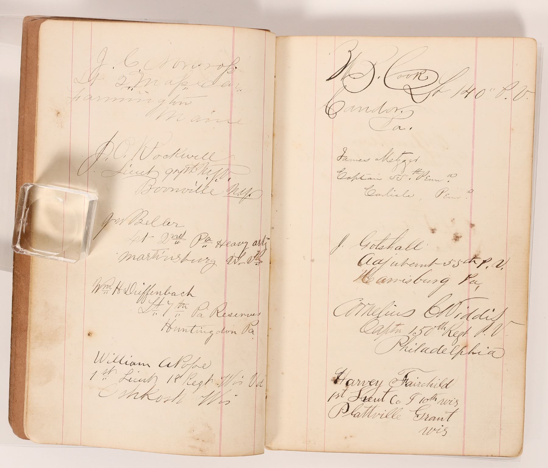 Exceptional historical record of Prisoners of war at Columbia, South Carolina compiled by A.A. Taylor, Captain, 122nd Reg, Ohio Volunteers of Cambridge Ohio. The book contains more than 470 autographs of Union officers with identifying regiments and other anecdotal material. The frontispiece is nothing short of fantastic- a professionally and very artistic hand drawn (black pen & ink) of Lady Liberty with an "Autographs" banner above a detailed wreath containing a Monitor, drum, bugle and cannon. Pages generally contain about four names each, sometimes five, rarely more. The men are all Union officers, though on close inspection I did not spot any generals. The dates range from July of 1863 to late 1864 and probably include many men transferred to this South Carolina prisoner camp from other sites. Each has written the record in his own hand, inclusive of their site of capture and their home town. This is very apparent, and may be the underlying purpose of the book - to document the Union officers in case something happens to them. Many were captured at Gettysburg in the first three days of July 1863, in which approximately 50,000 soldiers were killed. The contents of he book have not been published to our knowledge, and should be. Example: "David Wiston, Capt. 15th Mass Vols, Boston, Gettysburg, July 1, 1863"_x000D_