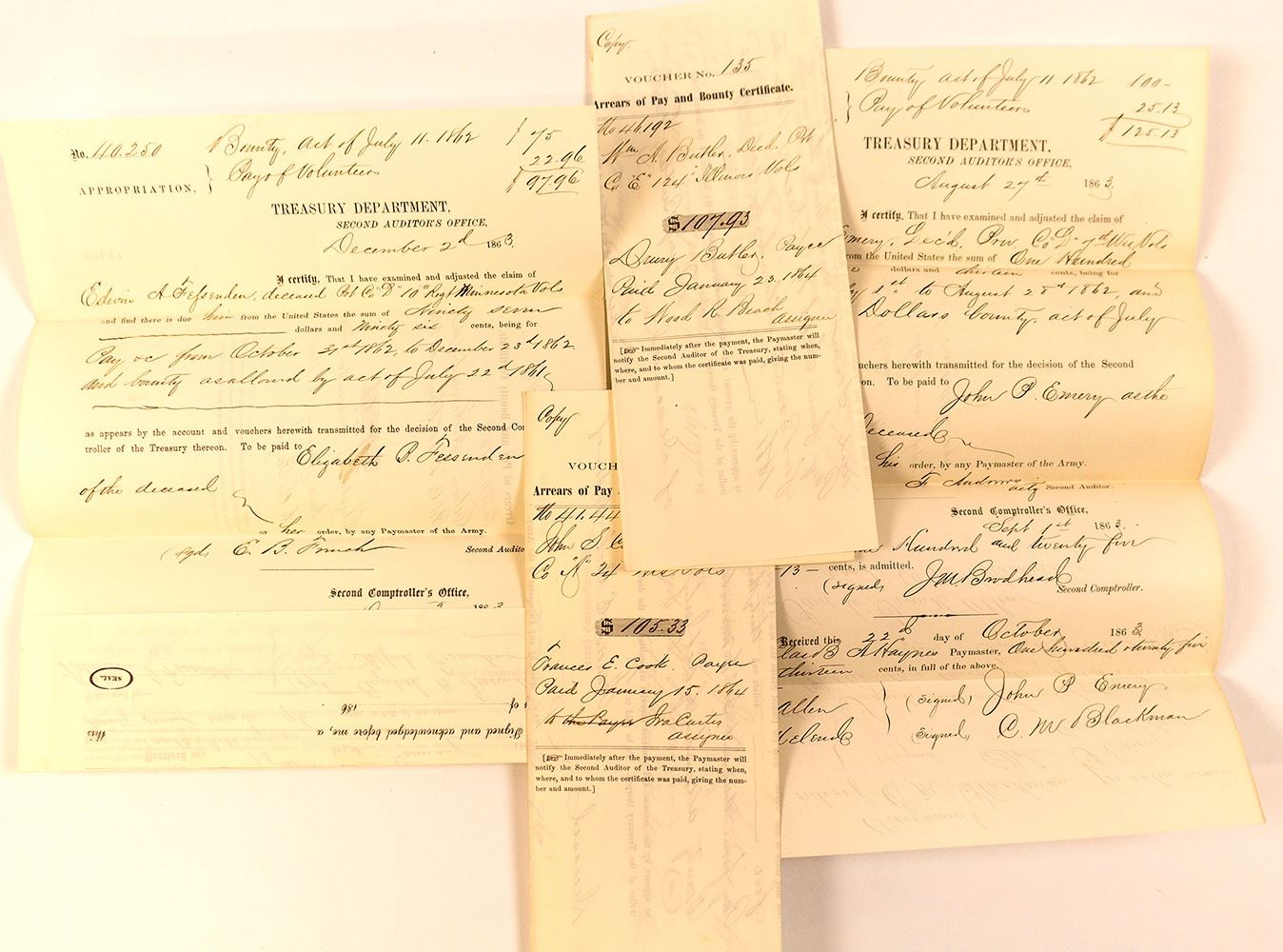 Four vouchers recording payment of "Arrears of Pay and Bounty Certificate" for soldiers killed in the Civil War. Two issued to widows, two to fathers and all in the vicinity of one hundred odd dollars. Soldiers from Wisconsin, Minnesota, and Illinois. Date: Location: HWAC # 53837