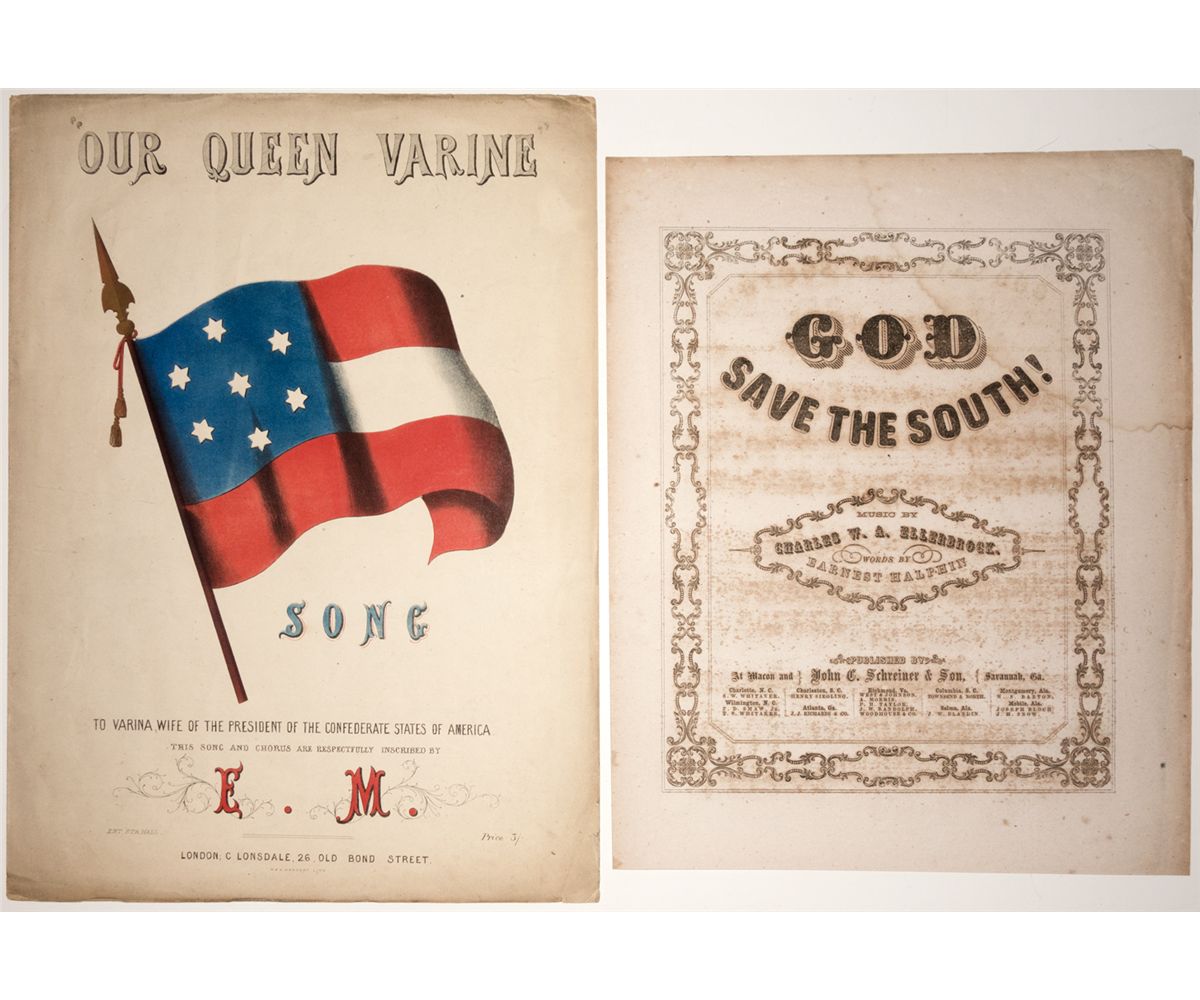 The other—God Save the South (12.5" H x 10" W). Music by Charles W. A. Ellerroock, words by Earnes Halphin; words printed on back. National Anthem of the Confederacy.