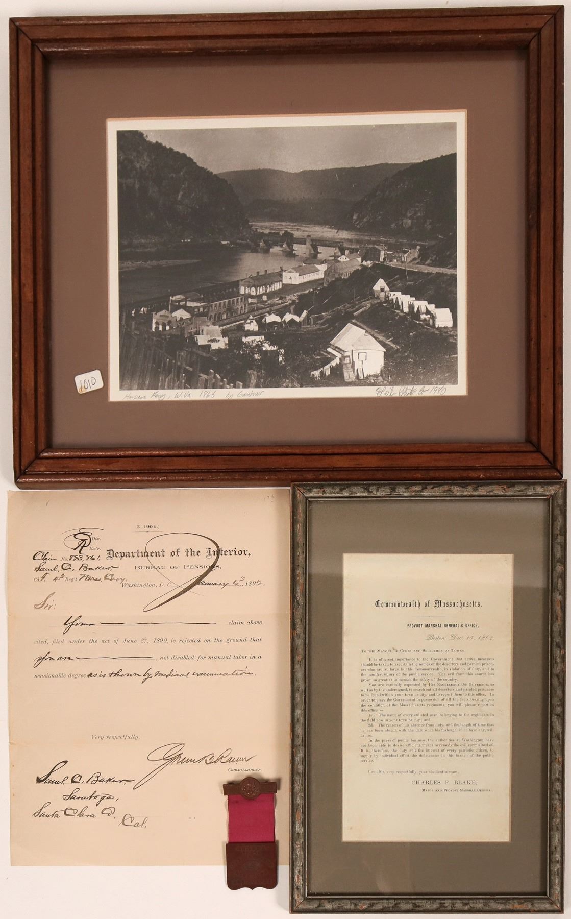 This is a lot that contains a request and denial document for pension from the Dept of the Interior Bureau of Pensions dated January 1862; the badge to the 16th encampment of the GAR from Iowa dated 1890; a broadside from the state of Massachusetts Provost Master General; and a photo of Harper's Ferry 1865 reproduced in 1980.