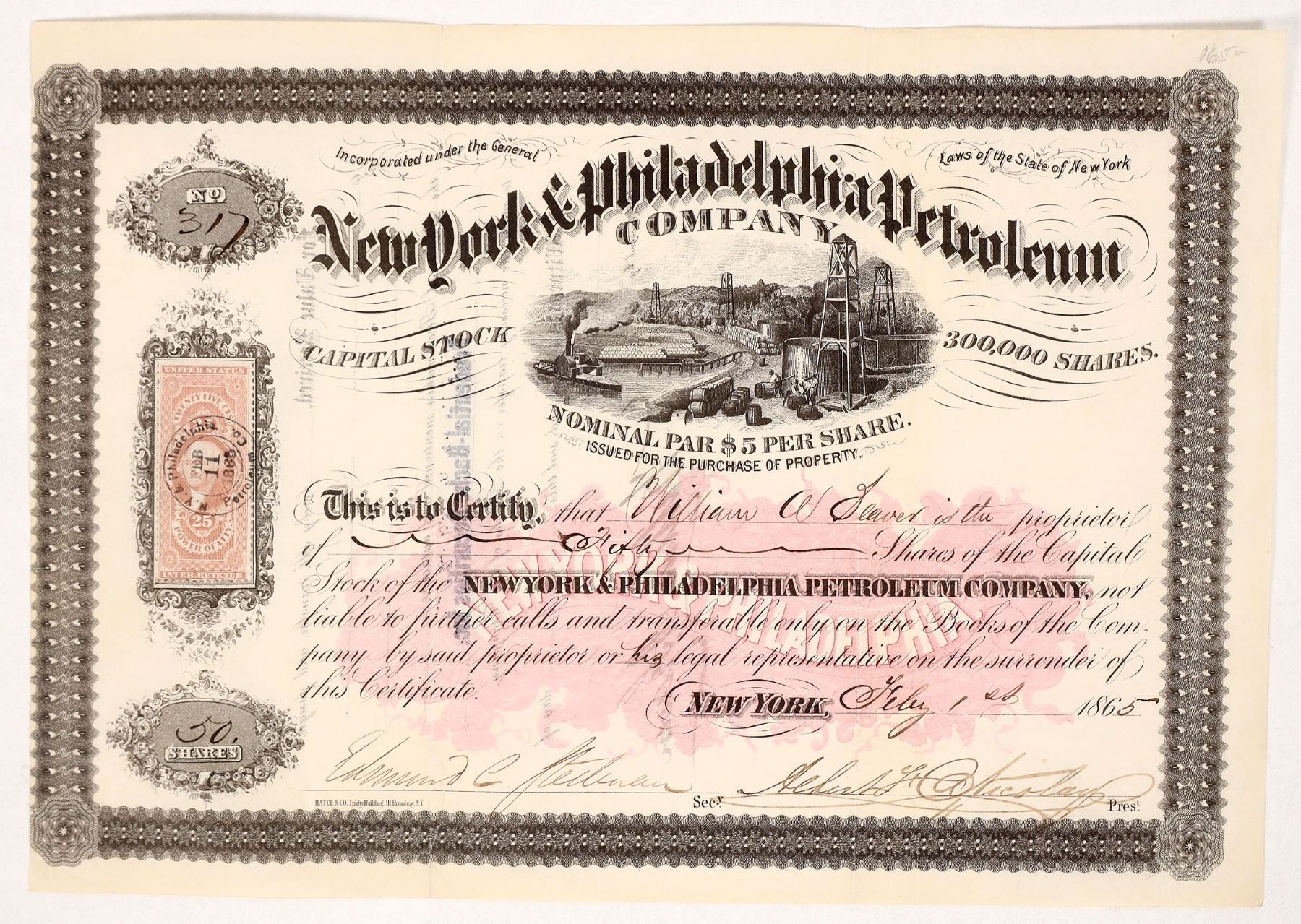 A stock certificate for 50 shares in the New York & Philadelphia Petroleum Company, made out to William W. Beaver in 1865. No. 317 issued. Signed by the company's secretary Edward C. Stedman (?) and president A. Nicolay; faint embossed seal in upper left area. 25¢ IR Power of Atty. stamp in stamp frame at left. The certificate is uncancelled and in great shape for its age; it has no damage aside from some creasing. Trimmed tight on left.