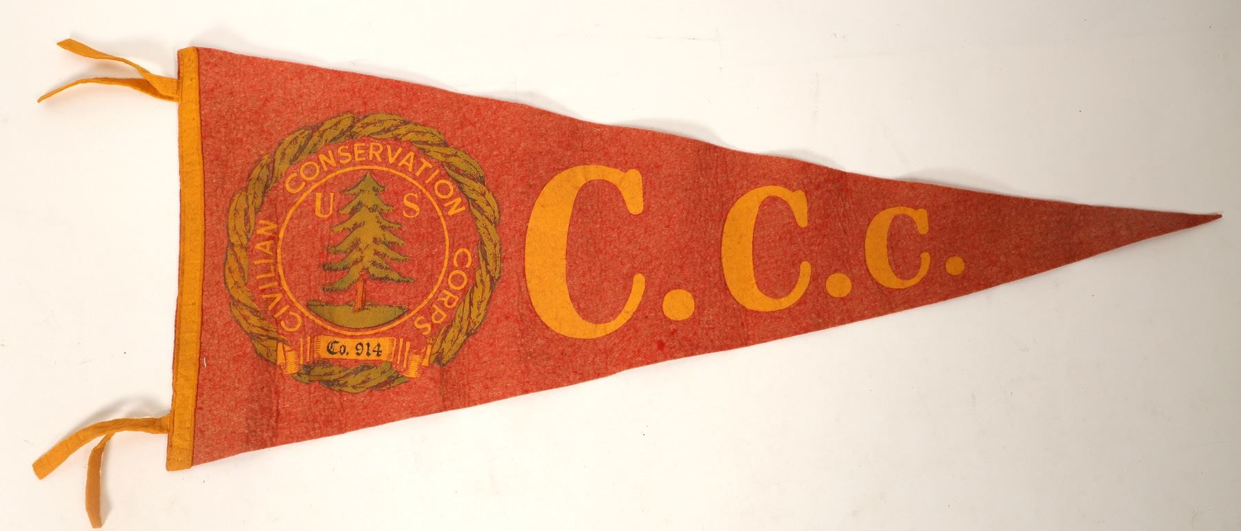 Orange pennant with yellow lettering and green foliage: In wreath: Civilian Conservation Corps / Co. 914; Big letters: C. C. C. 12 by 30 inches. Company 914 in California worked on projects in 1933 & 1934 in North Bloomfield and Nevada City.