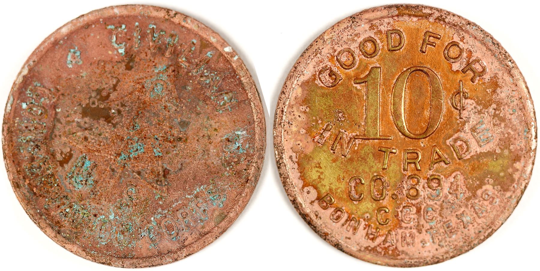 Round brass 24mm. CIVILIAN CONSERVATION CORPS. // GF / 10C IT / CO. 894 CCC / BONHAM, TEXAS. Please note surface condition issue. HWAC# 62312 Date: Location: Bonham, Texas