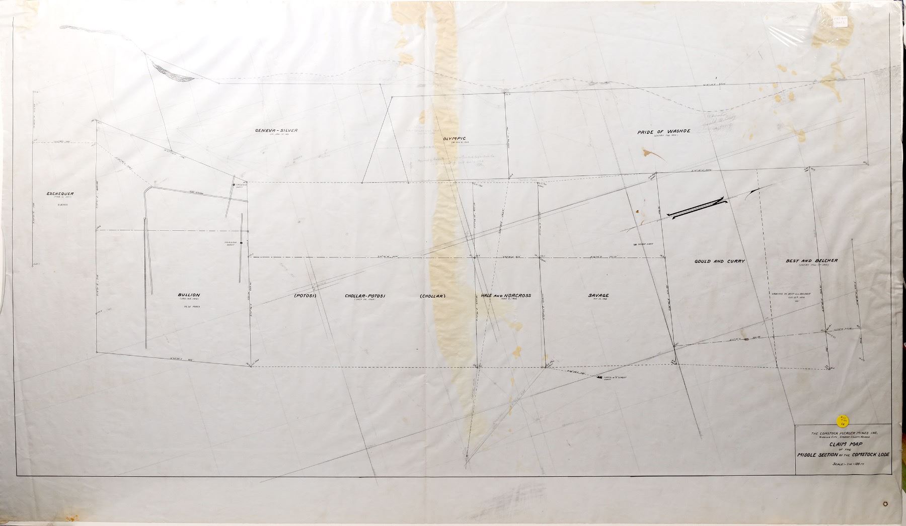 31 x 56" black ink on velum original claim map, 1" to 100', for the Comstock Merger Mines Inc. this map shows the gut of the Comstock from the best and belcher on the right (north) to the exchquer (south). It shows additions of several shafts and the original outcrop of the "Gould and Curry Vein" at the top of the map along with some colored high grade sections. This is a choice working map from the 1920s production period. Also probably used by the Kendall family for their work on the Comstock after WWII. Virginia City Nevada Franklin Collection