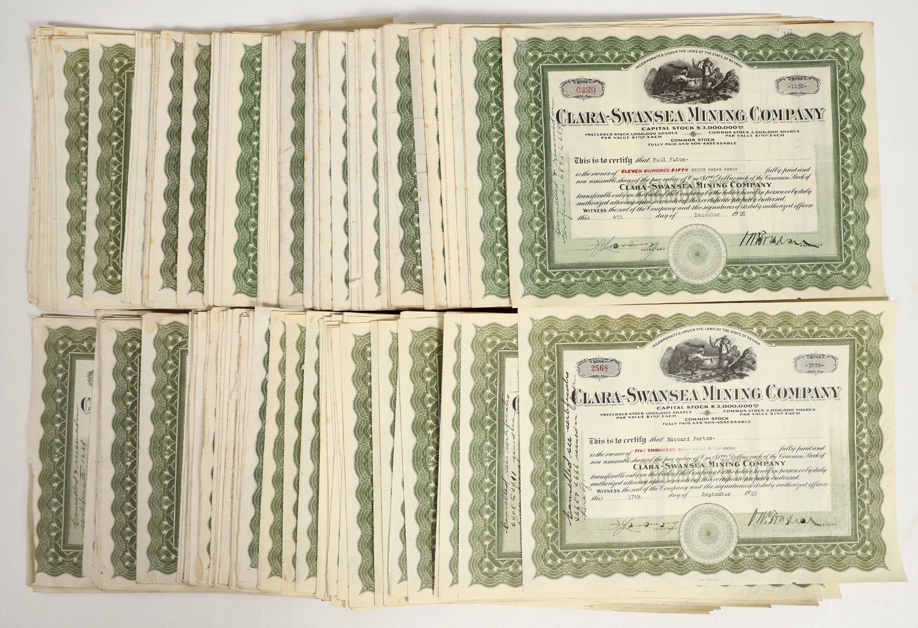 About 250 Clara-Swansea Mining Company Stocks c. 1925-30. Issued/cancelled, some with revenue stamps and endorsements on reverse. See Photos.