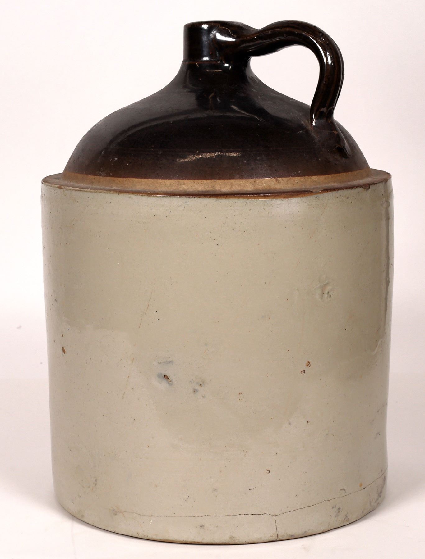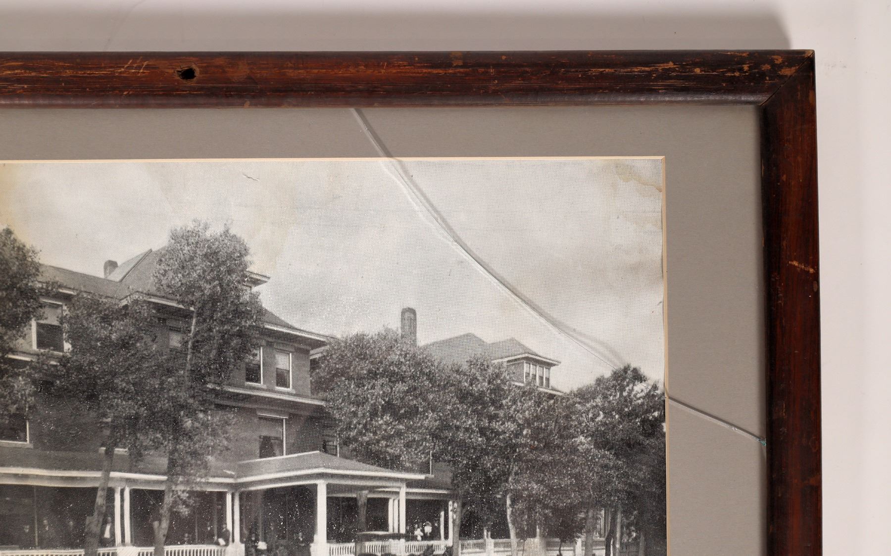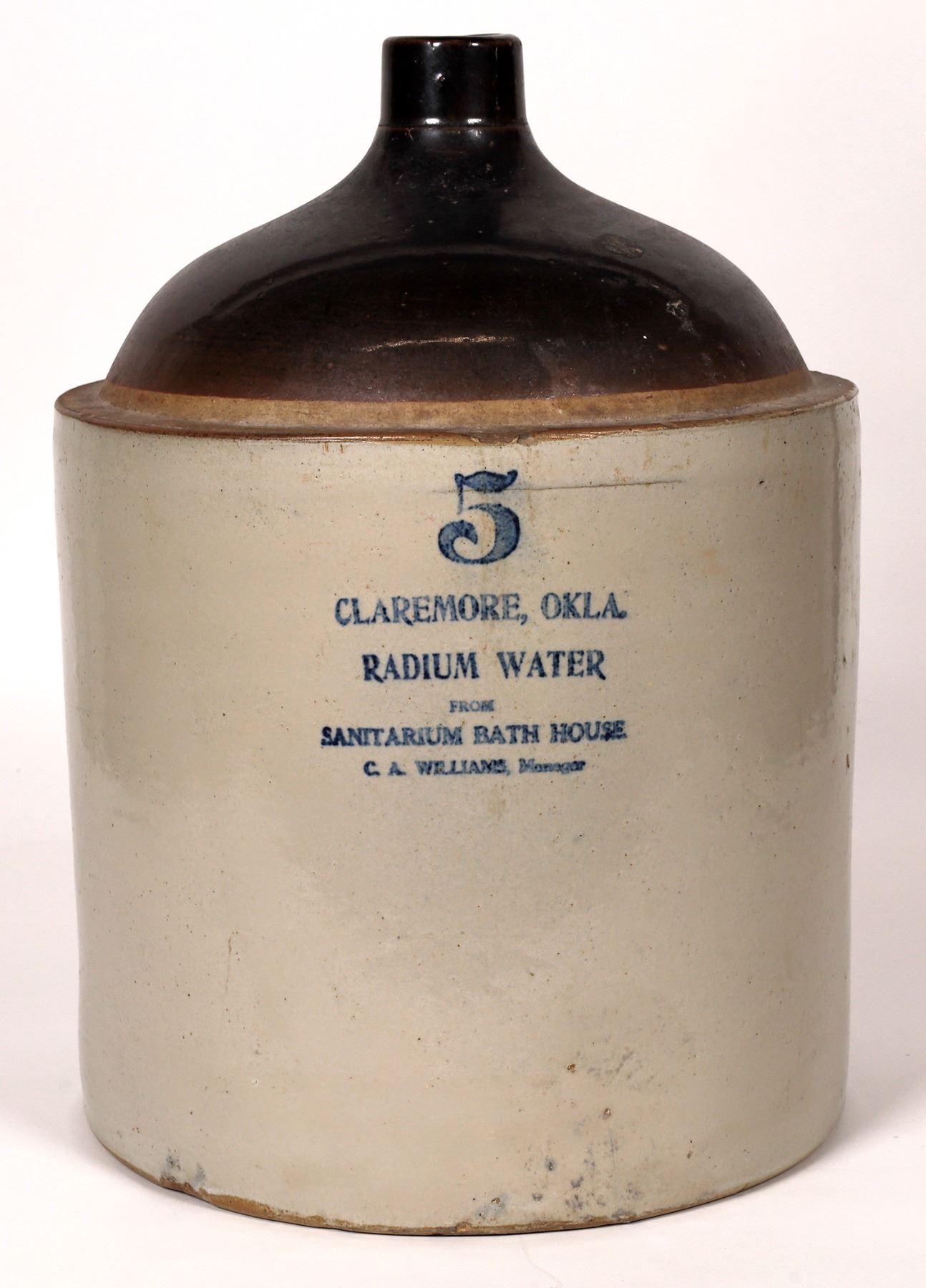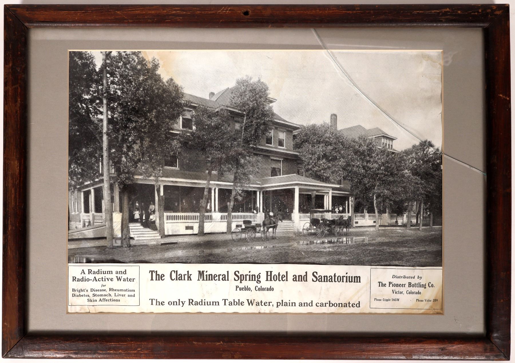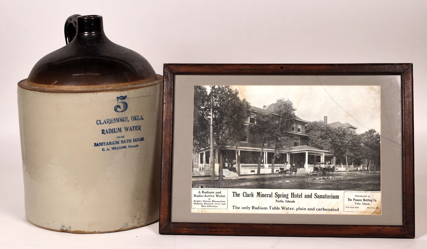 5 gallon 2 tone jug, Claremore, Okla./Radium Water/From/Sanitarium Bath House/ C A Williams, Manager. 4 shoulder chips, 16" crack along bottom of back on handle side. Please inspect. Also framed The Clark Mineral Spring Hotel and Sanitorium/Pueblo, Colorado advertisement. Framed with cracked glass, water stain. Frame 13.5x19.5".