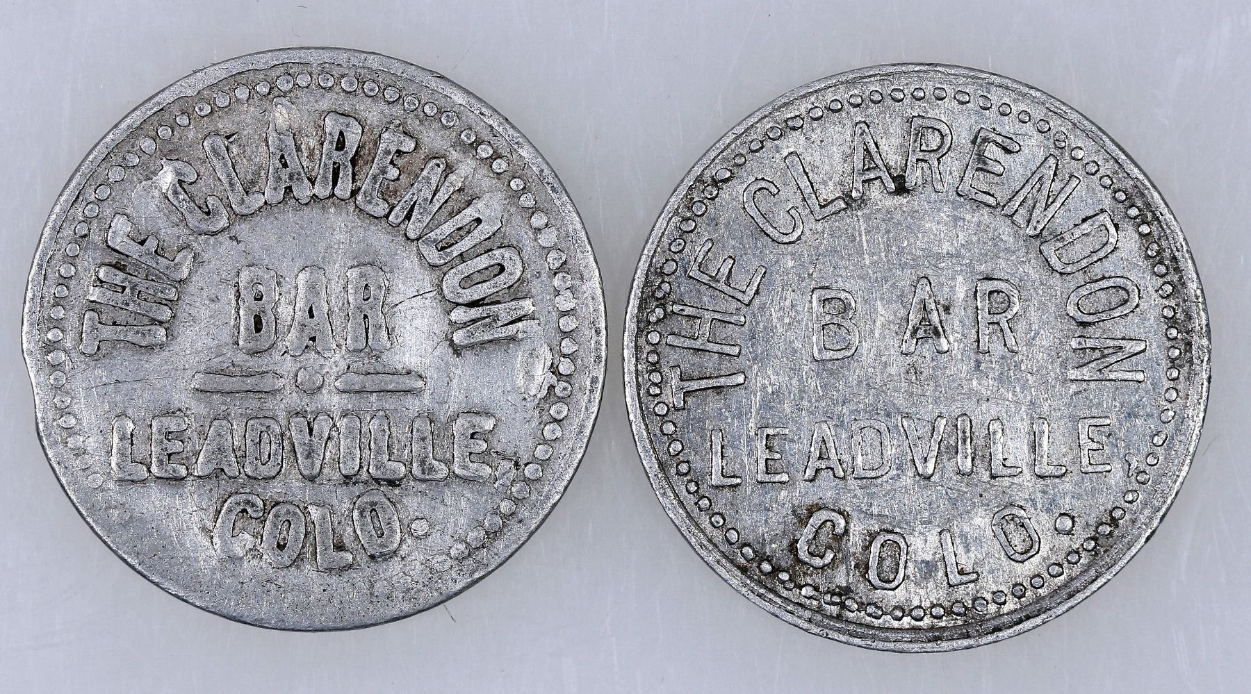 Two similar tokens from the 1896 saloon in Leadville: the listed one is: THE CLARENDON / BAR / LEADVILLE. COLO. // GOOD FOR / 5¢ / IN TRADE; Al., rd., 25 mm. The unlisted one has two lines and a dot between Bar and Leadville, and no cent sign next to the five on the reverse.