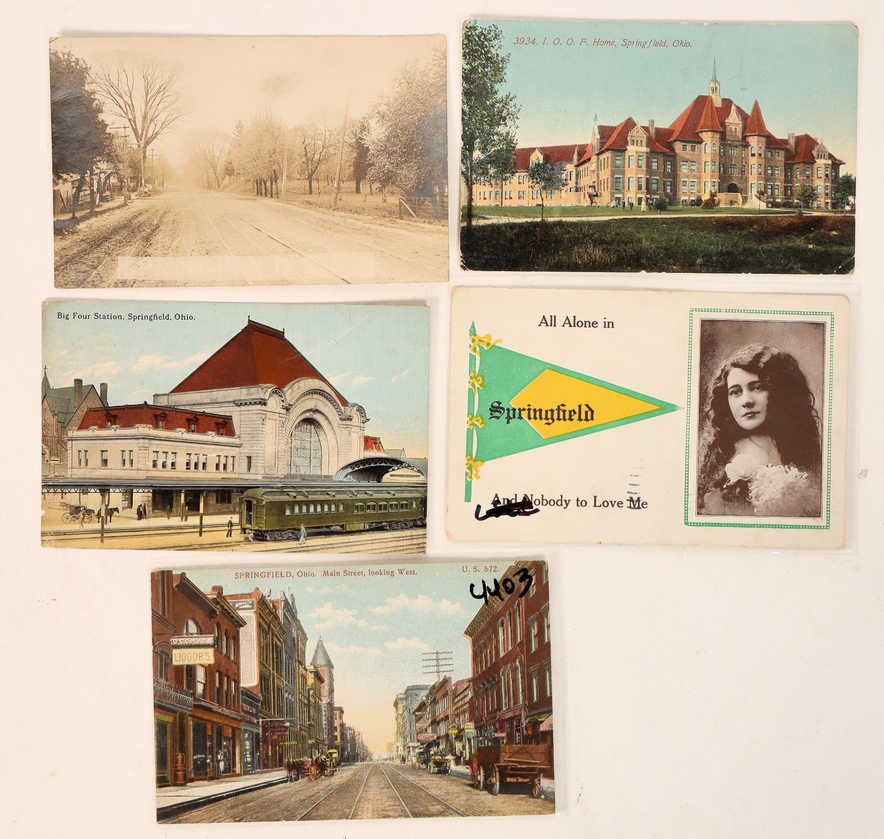 5 Springfield postcards. 1 RPC-rail track on a street. Also, Main St., pennant, IOOF Home, Big Four Station.[ Clark County Ohio